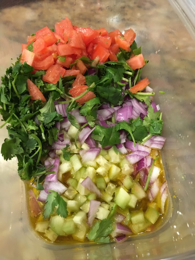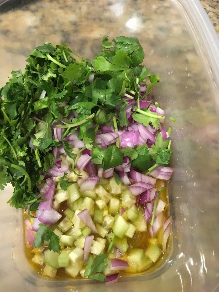野菜を刻む。タマネギとパクチーが重要。今日はそこにあったのでキュウリ入れた。たぶんホンモノでは入れない。もちろん、パクチーが嫌いなら他の緑色のものを入れれば済むこと。