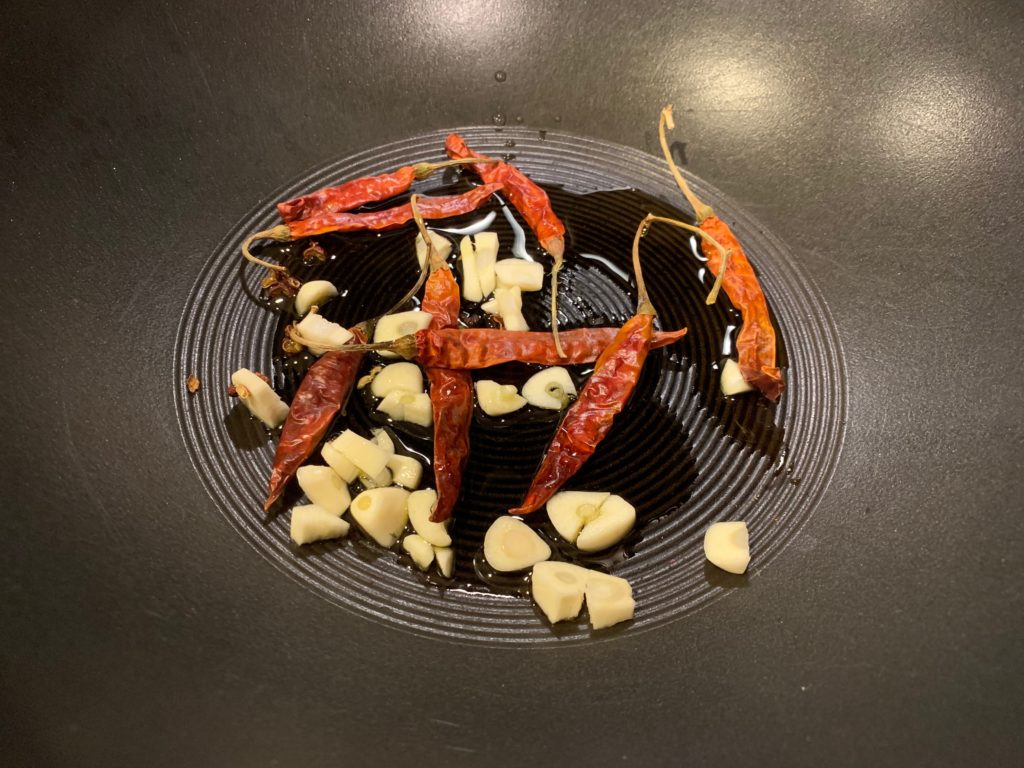 いつもの面子。にんにく、唐辛子、花椒にオリーブオイル。