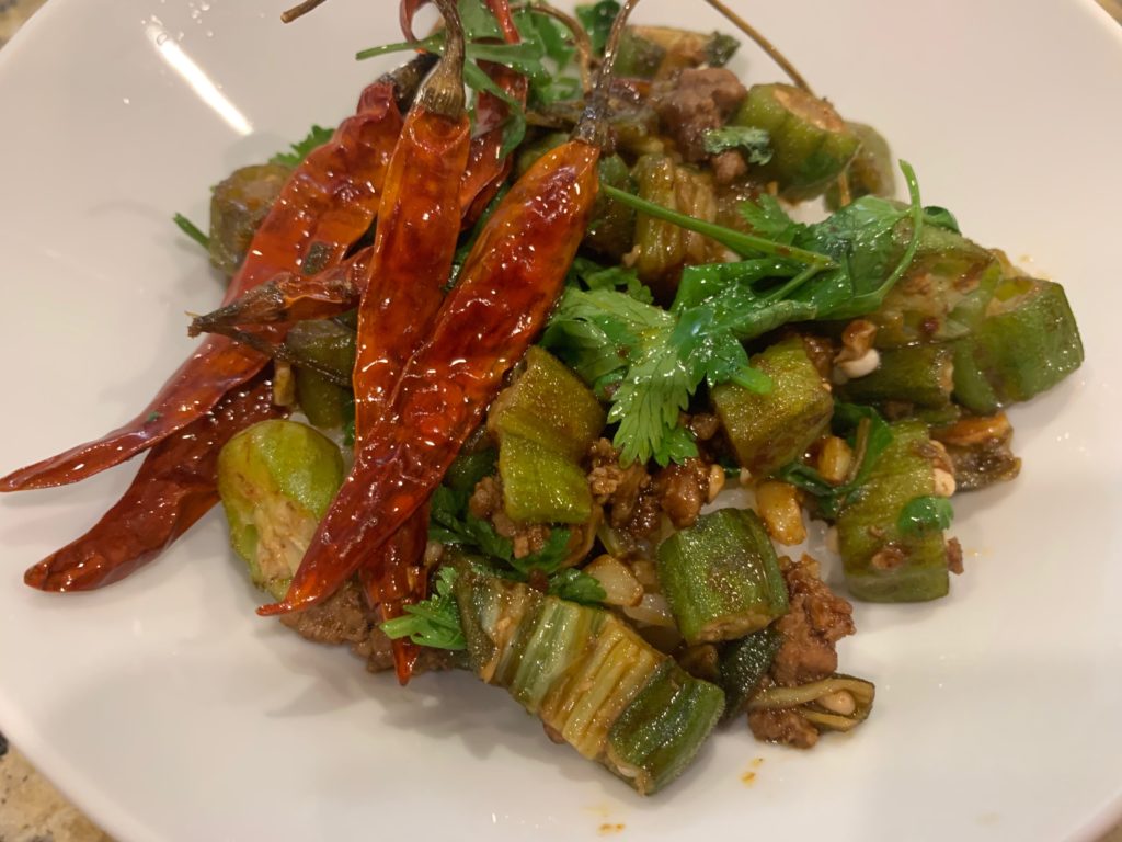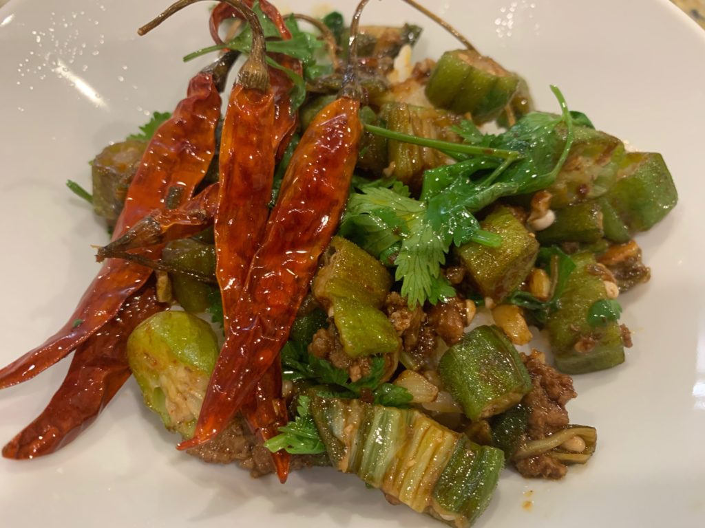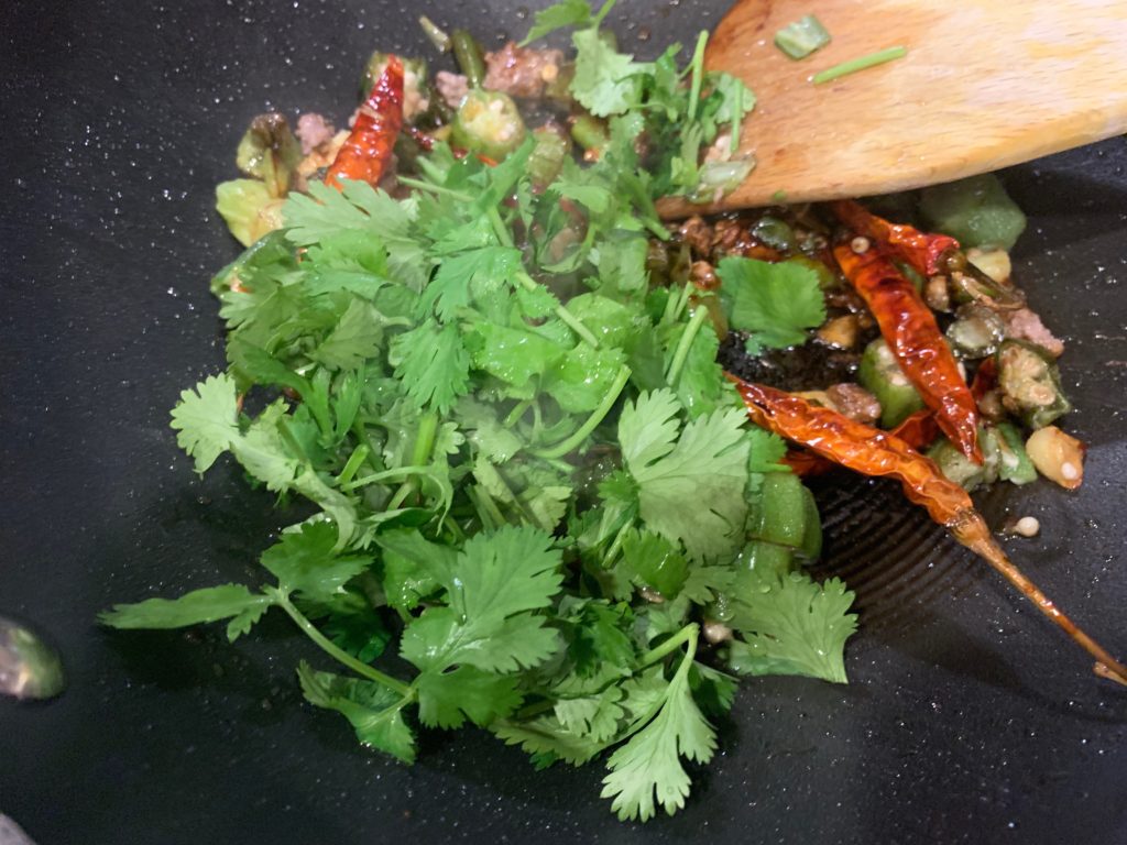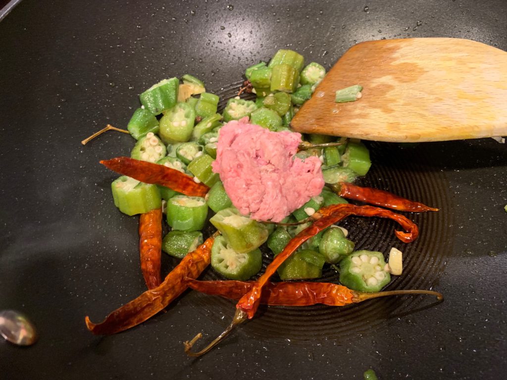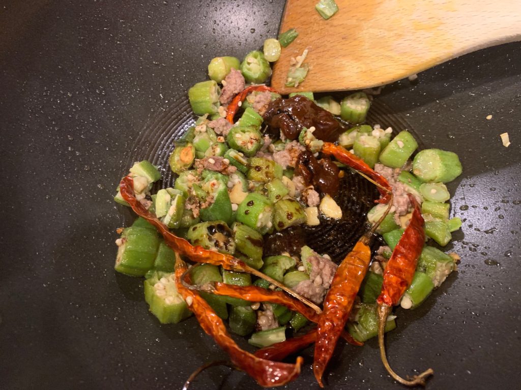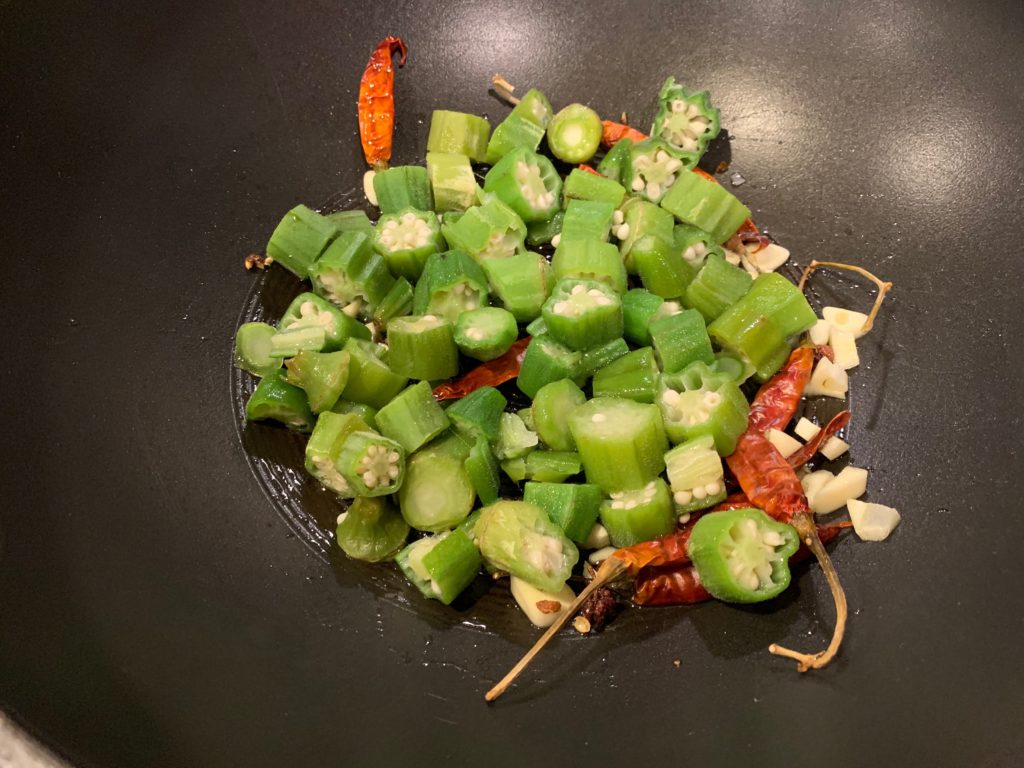 中火でゆっくり温めたら、強火にしてオクラ投入。