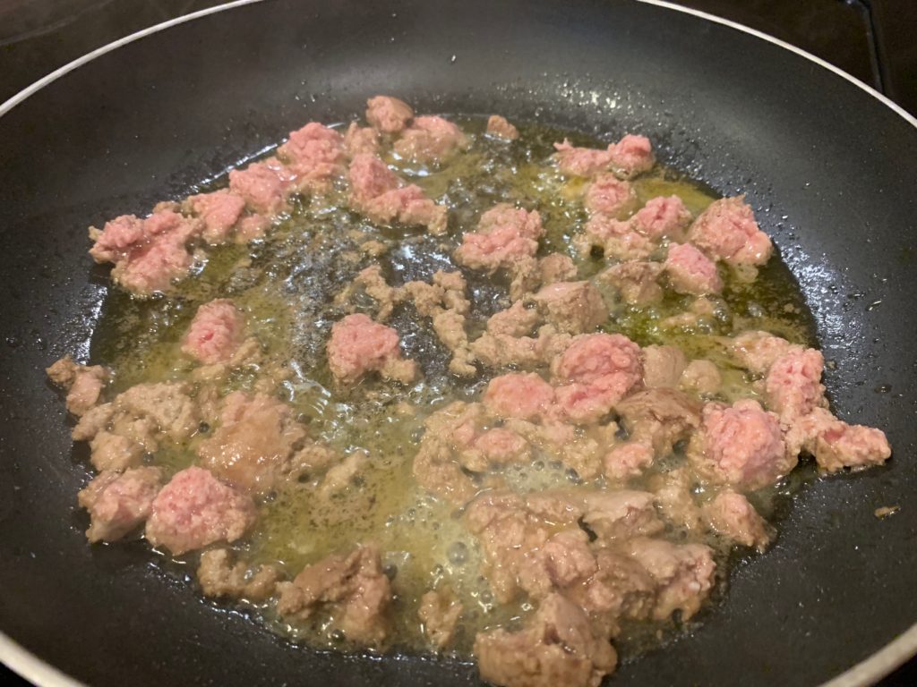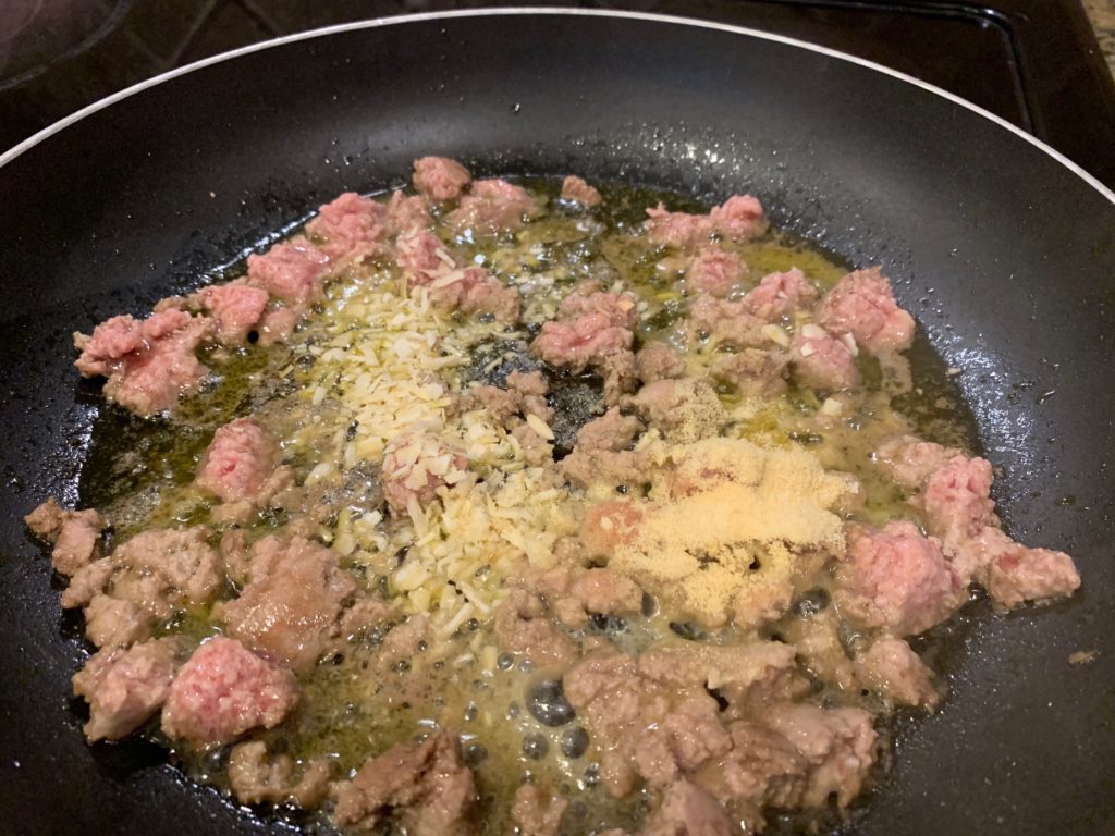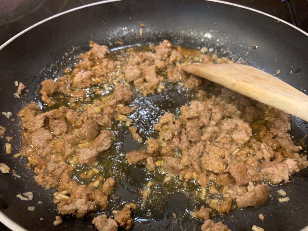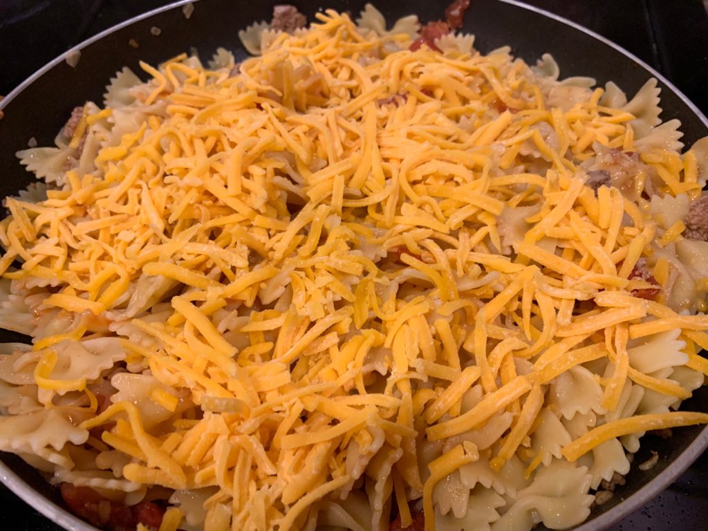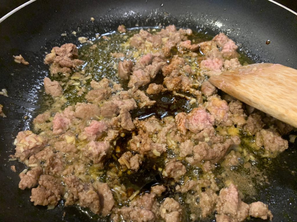 時々混ぜながら、水分無くなるまで煮たら、ピザチーズ。今日は黄色のチェダーだったけど、ピザチーズなら何でも良し。どうせ美味い。