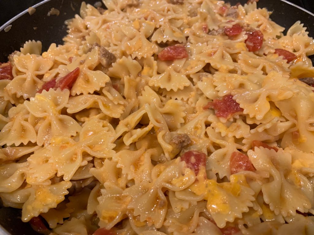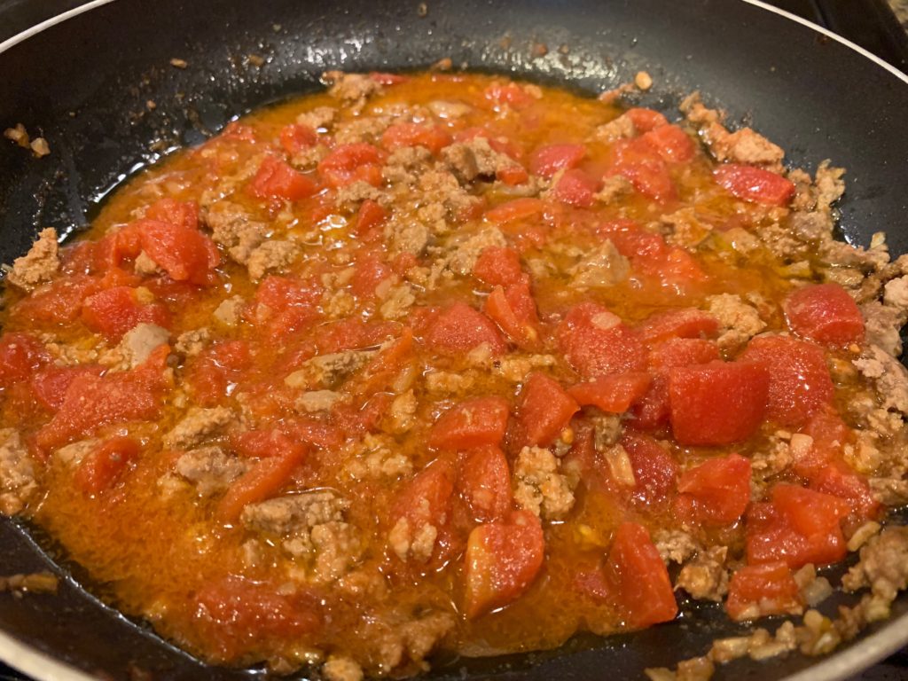 10分くらい、時々混ぜながら放置すると、こんな感じにチーズとかトマトとかが全部混じり合って色が濃くなる。これで出来上がり。