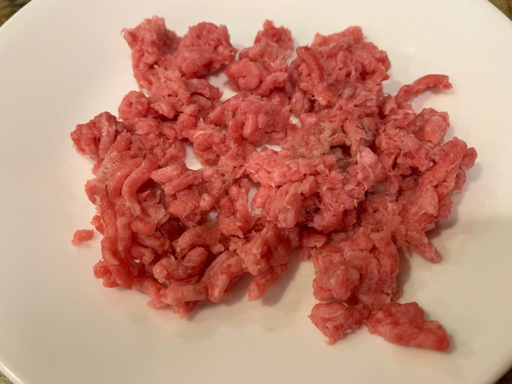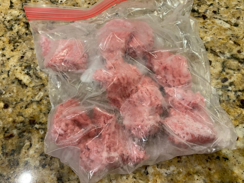 牛ひき肉(牛じゃなくても美味いと思うけど)、こうやって冷凍してる。ジップロックに入れて外側から指で押してちぎって分けて冷凍すると、小さく凍る。