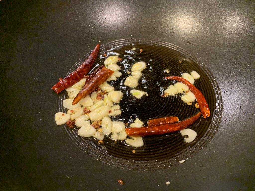 ニンニク(必須)、唐辛子(オプション)、花椒(オプション)。唐辛子はこのまま食べるわけではなく、油で煮て、旨味だけ絞り出すのだ。唐辛子は辛さ以外の旨味みたいなのがある。