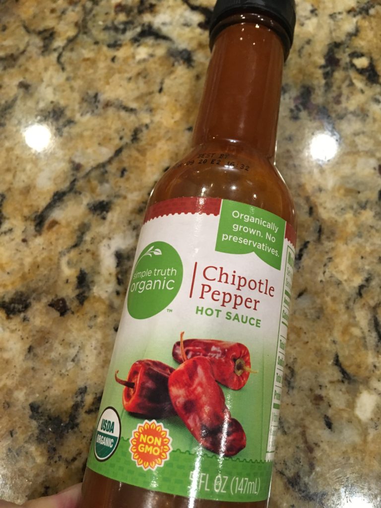 そして電子レンジに30秒入れてるあいだに、チポーレ調味料。これは黒牙のストアブランドのやつ(オーガニックなのはお詫びします)だけどかなりよい。なければタバスコブランドのチポーレを探そう。