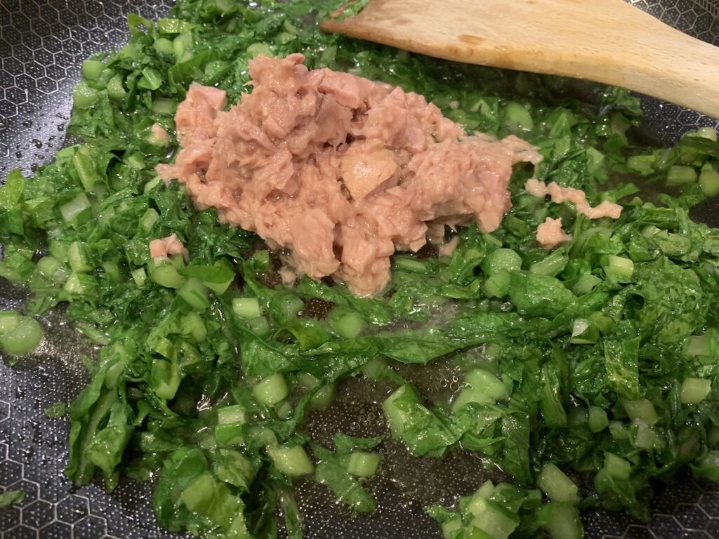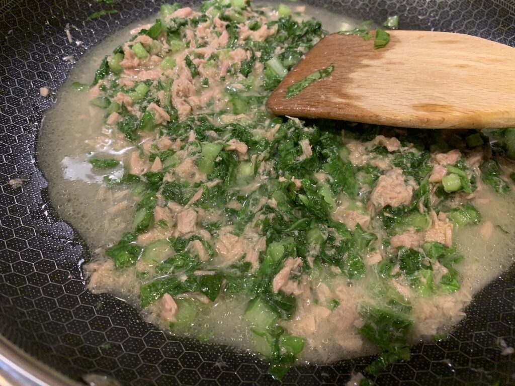ツナ缶を汁ごと。今回はオイル缶使ったけど、水缶でもよし。匂いが気になるならガーリックパウダー。