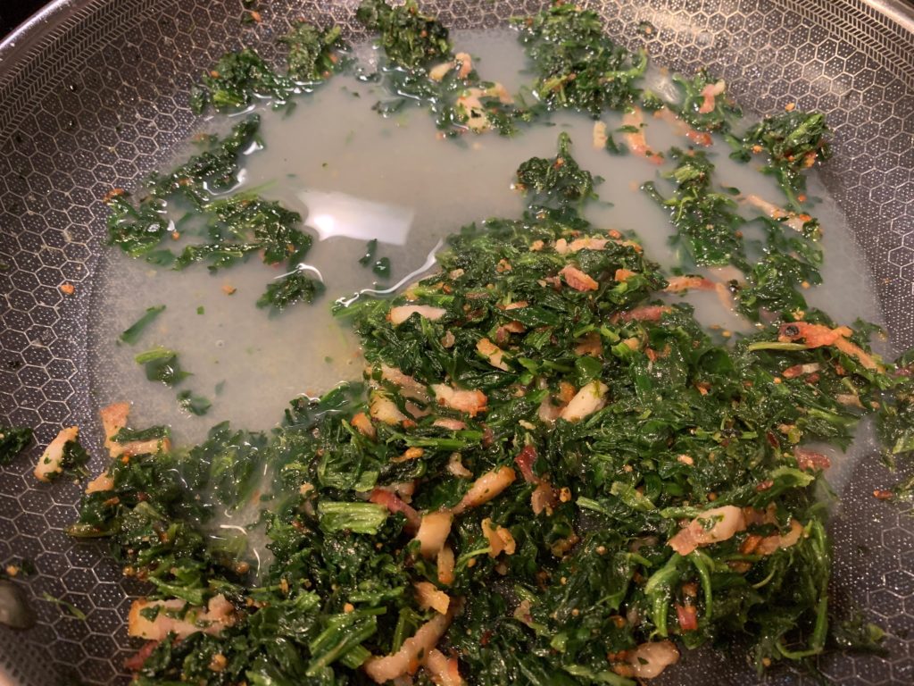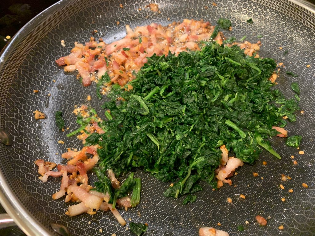 冷凍庫から取り出したばかりの新鮮な冷凍ホウレンソウをレンチンして解凍したやつ。