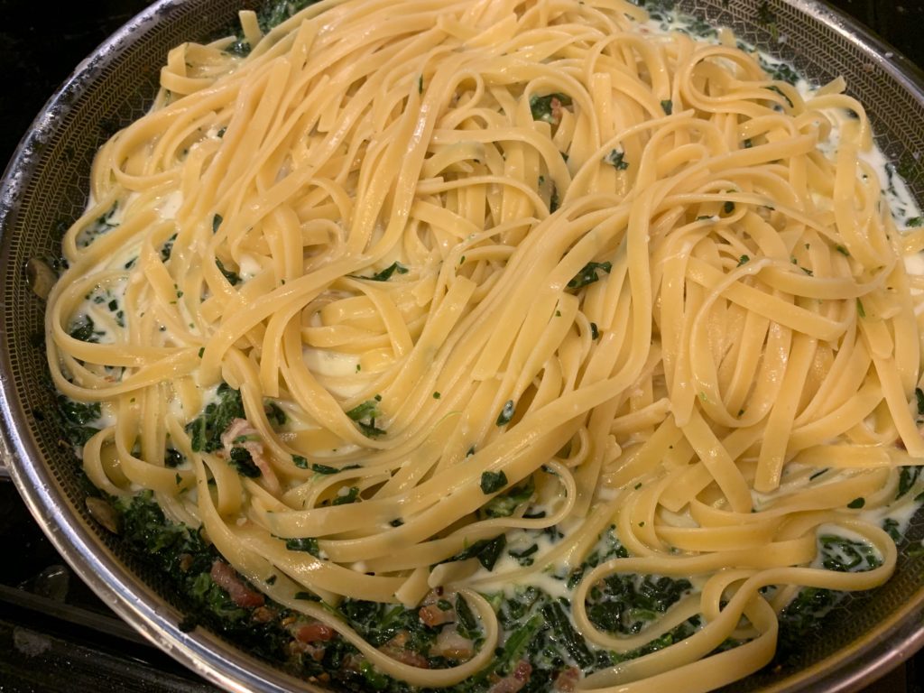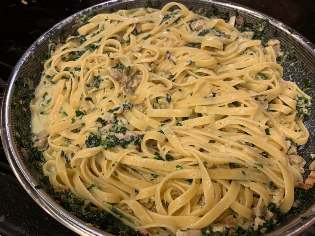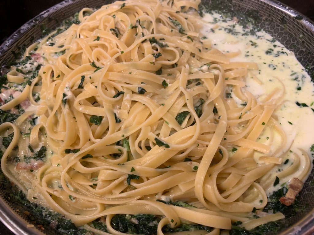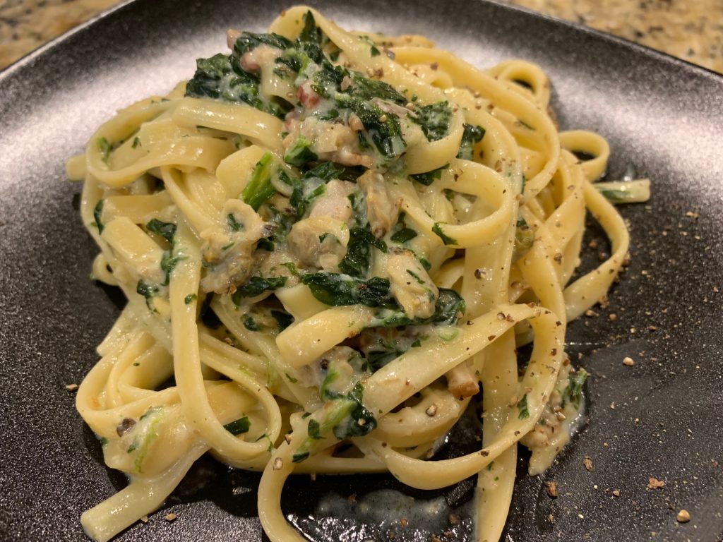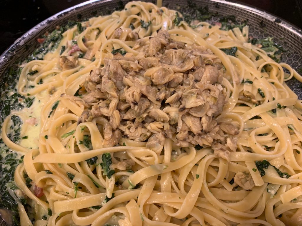 ニューイングランドクラムチャウダーから芋を取り除いてもっと濃い目なやつにフェトチーネをみたいなイメージだったんだが、結局あの名作ホウレンソウパスタに近いものになってしまっている事には気づかないで欲しい。実際、全然違った感じの味がするこの缶のおかげで。