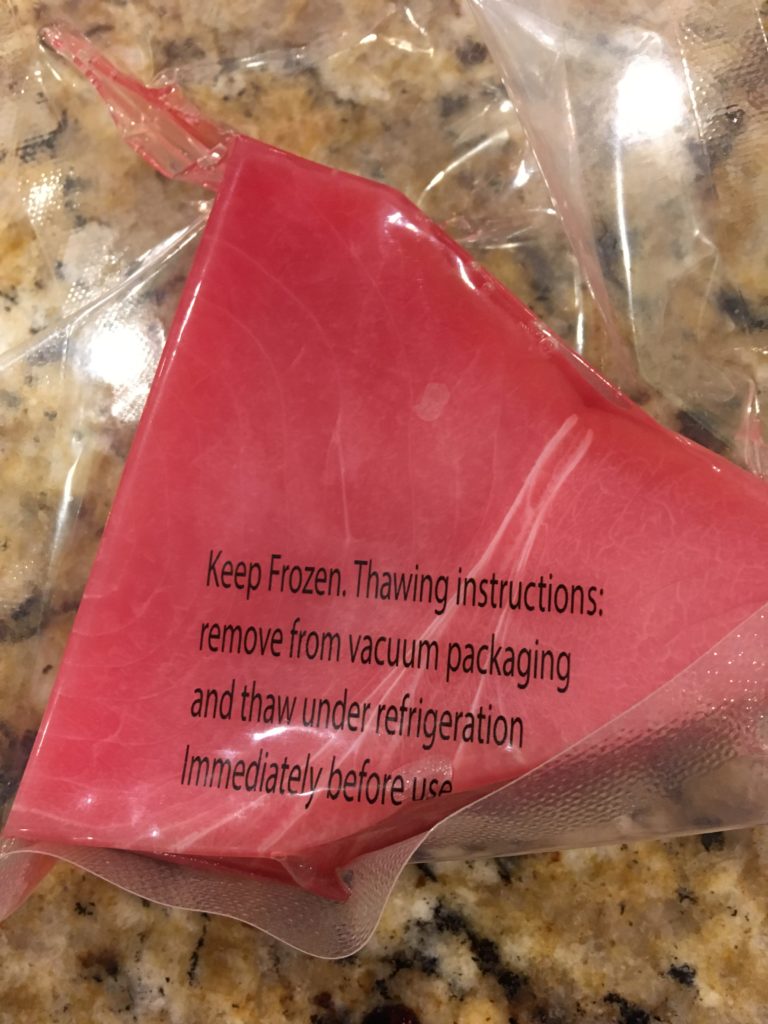 冷凍なので解凍する。このパッケージのまま解凍するなと書いてある事が多いけど、ボツリヌス菌を繁殖させるかもしれないので、やめたほうがいい。
