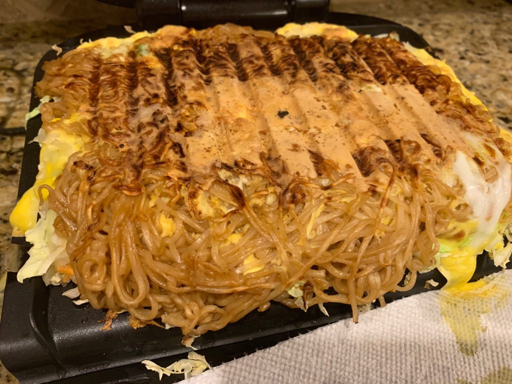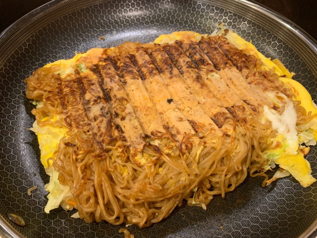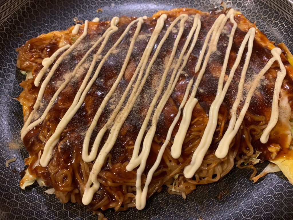 オタフクソースとマヨネーズ。フライパンでソースが焼けるのがよいわけで。