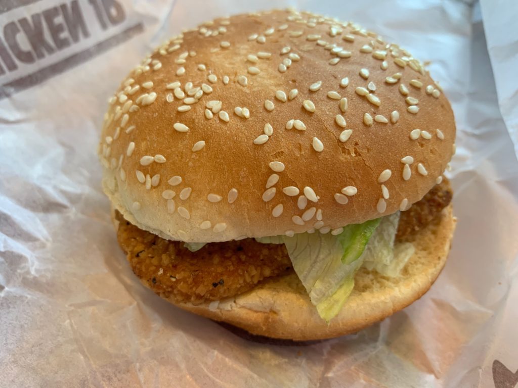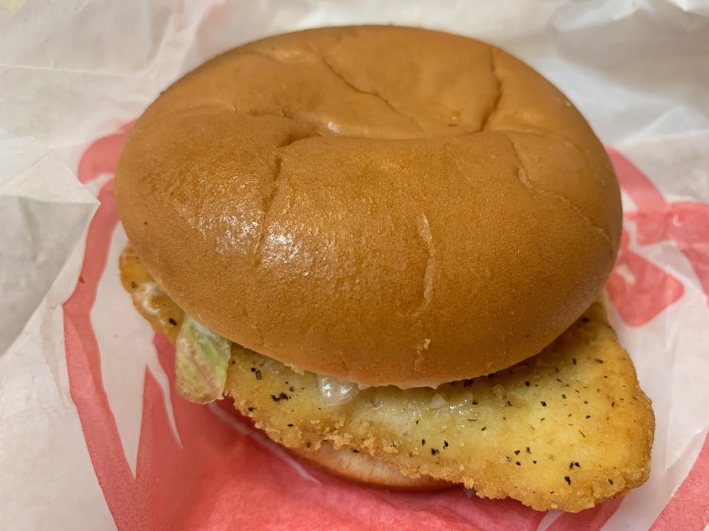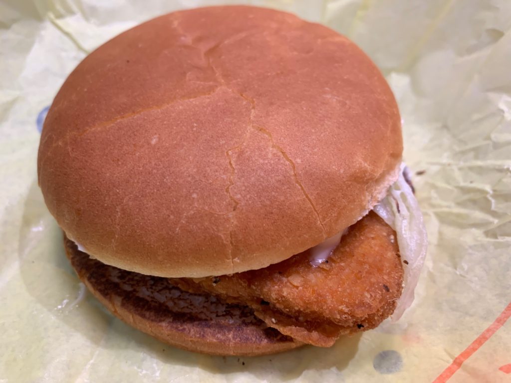 チキンパティは黒胡椒で圧倒しに来るやつ。お子様にはこれは辛いらしく、全然ウケない(そしてそれはたぶんわざと)。パティの中身はナゲットのような白身の優しさと赤身の美味さを合わせたかのような完璧な美味さ。それでも黒胡椒がかなり立つ。