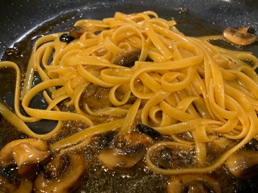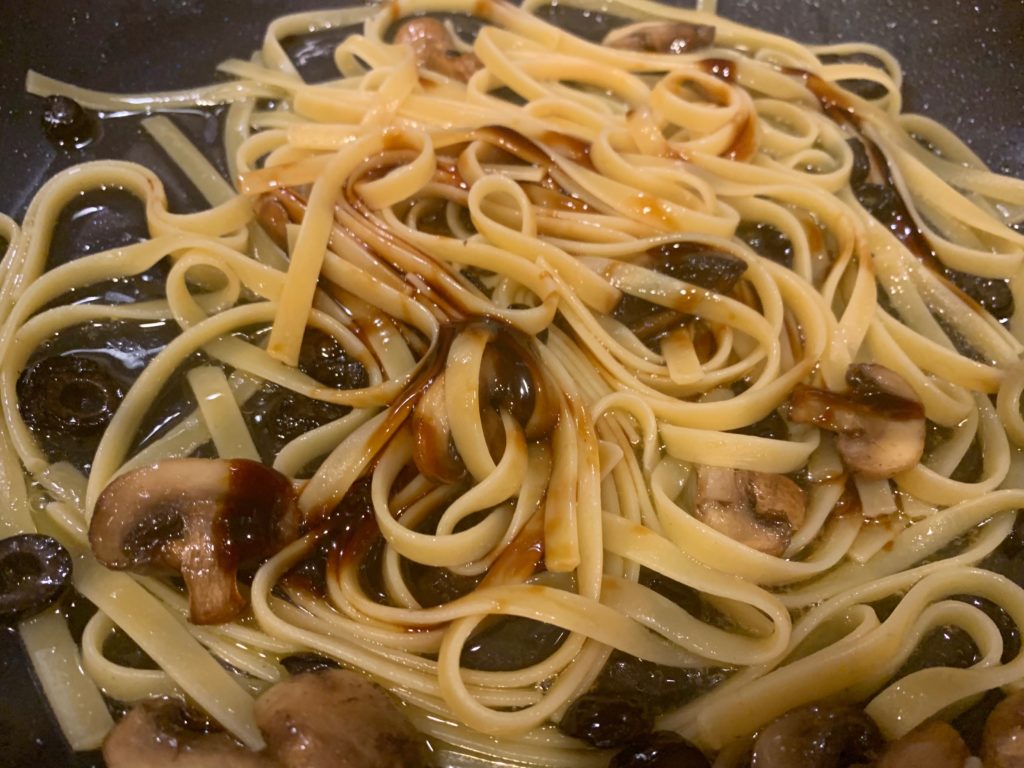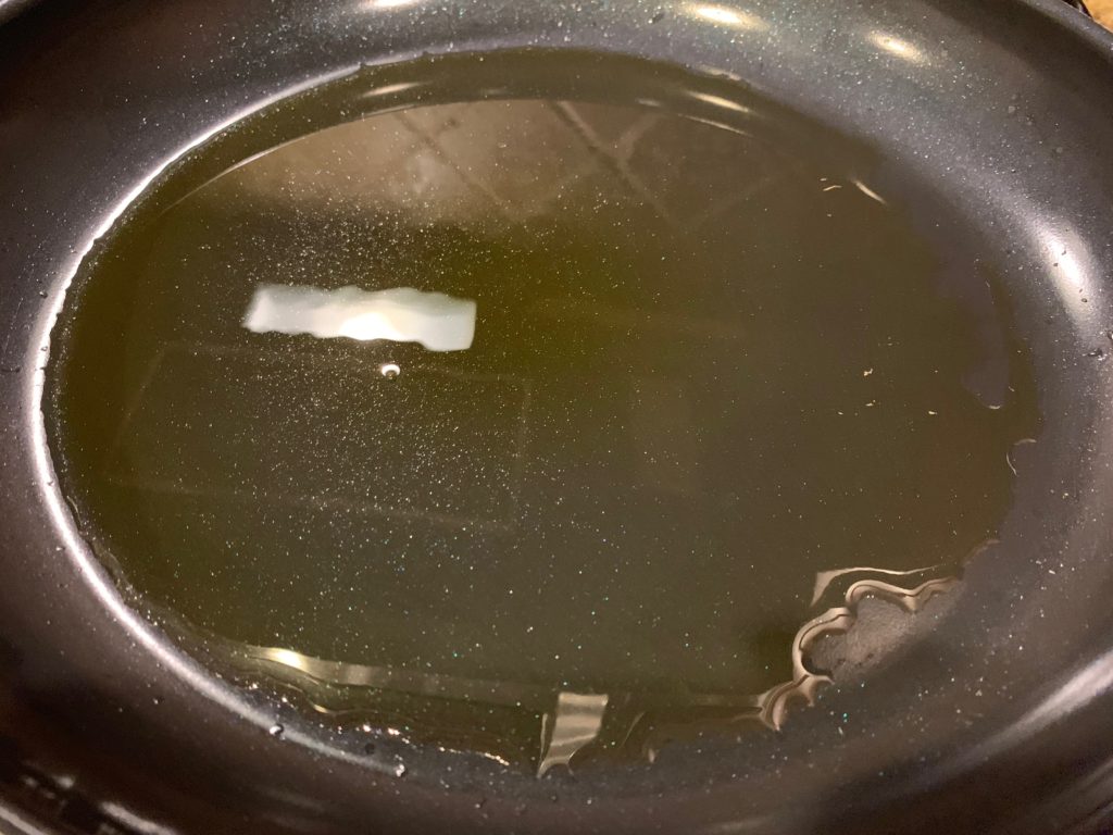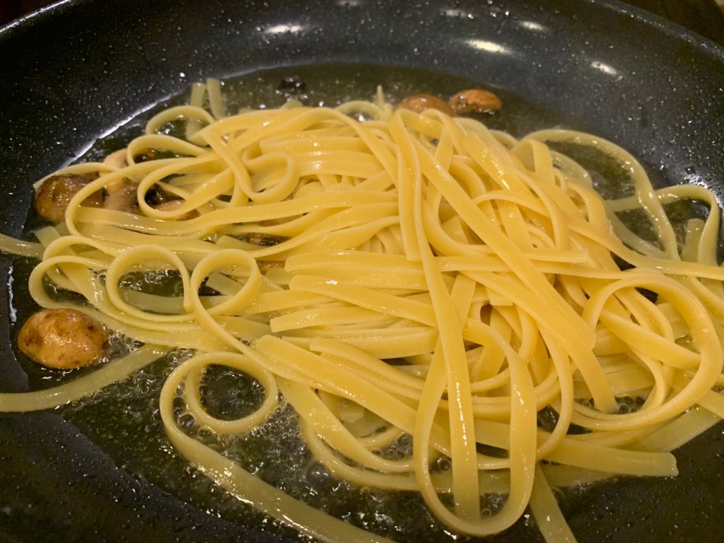 もちろん目をつむってオリーブオイル。茹で時間が残り4分くらいで強火に。
