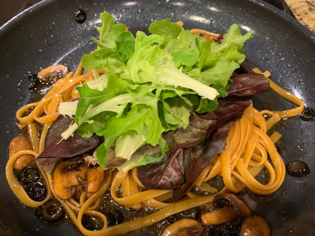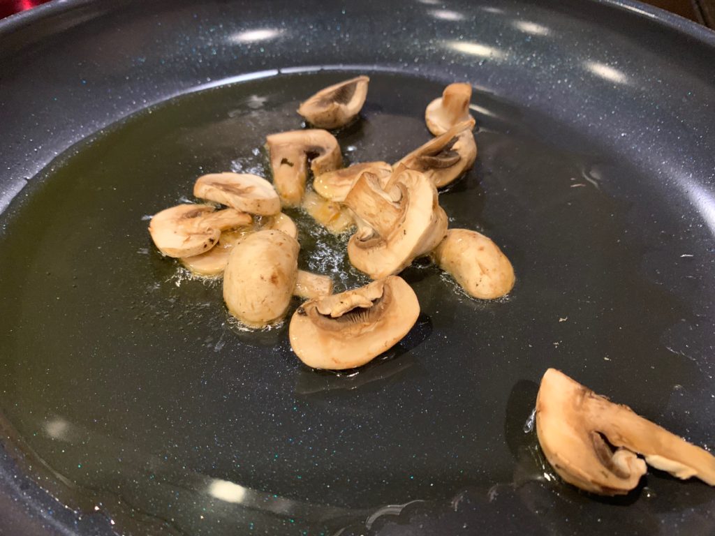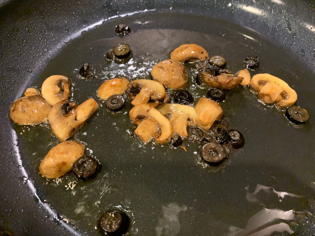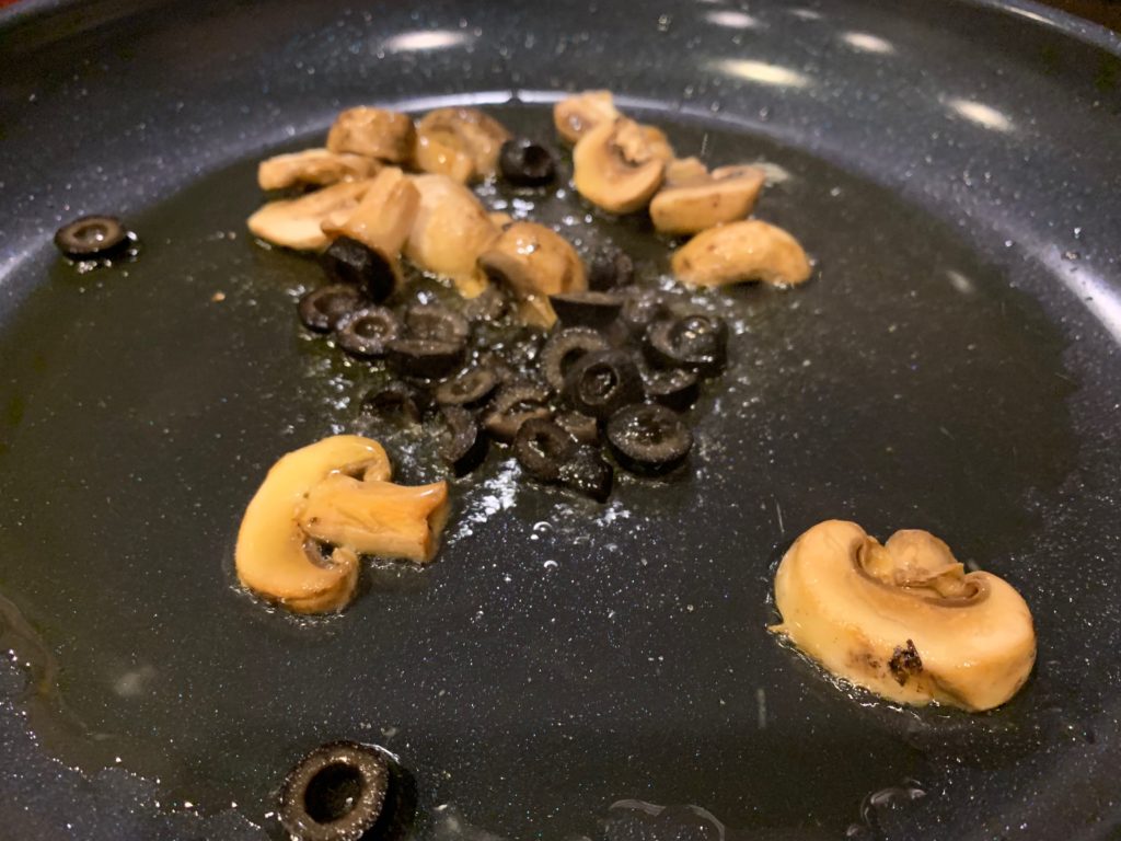 もちろん目をつむってオリーブオイル。茹で時間が残り4分くらいで強火に。