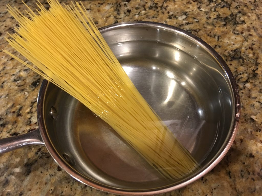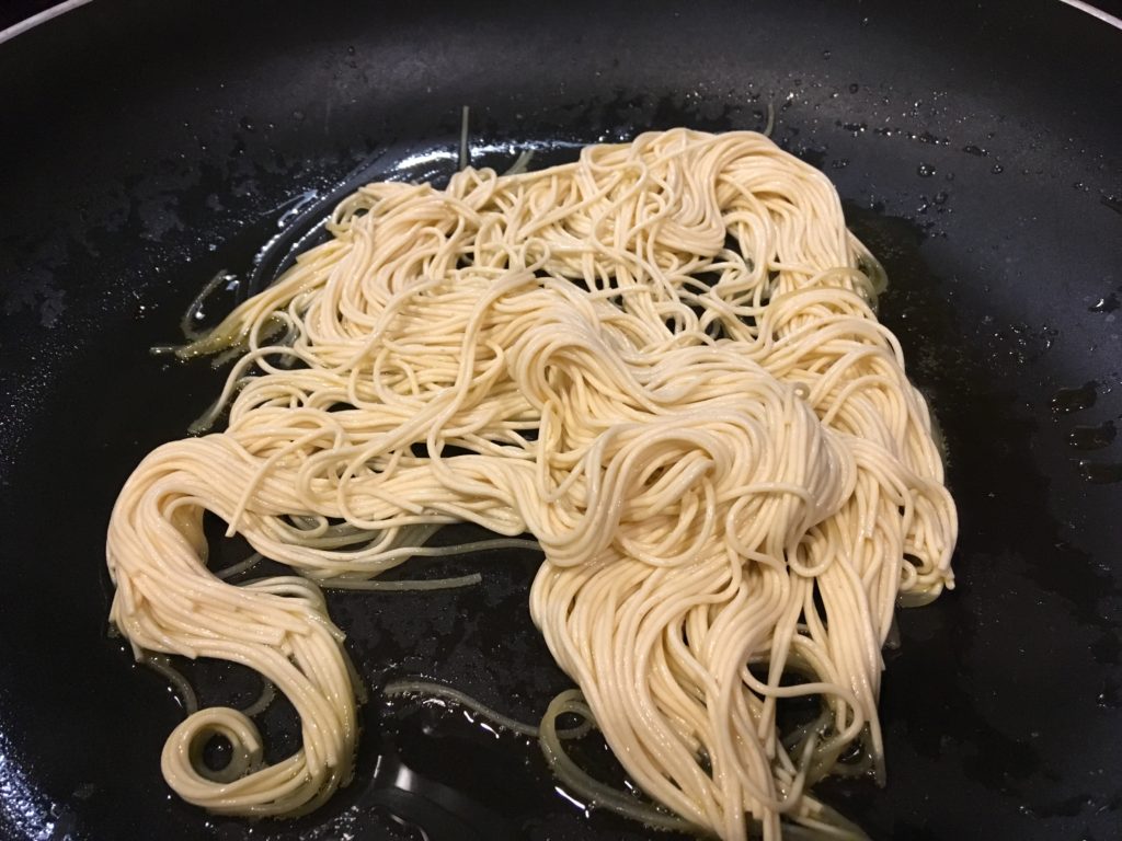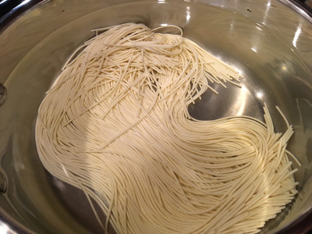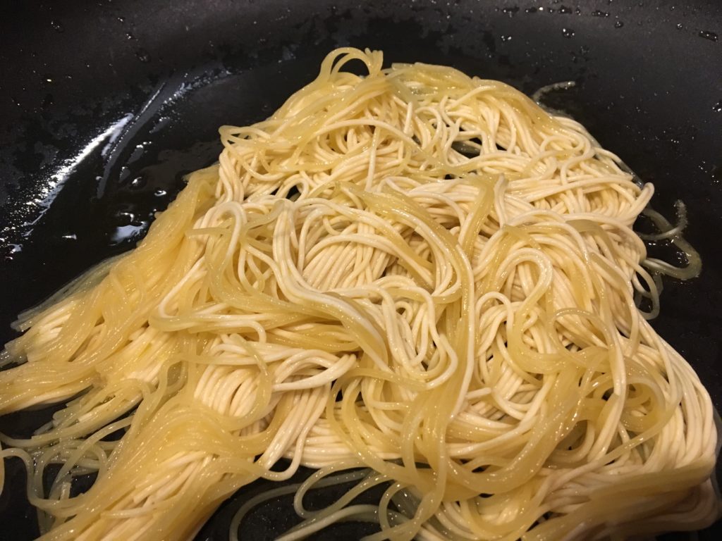 鍋に水、そしてパスタ。今回は天使毛を使用。普通のスパゲティなら6時間程度放置。天使毛(Angel Hair カッペリーニ)なので2時間。油そばでおなじみのモチモチ麺。焼きそば専用麺にはもう戻れない。(ご注意ください)