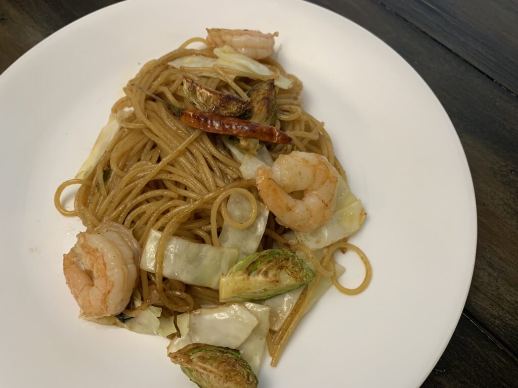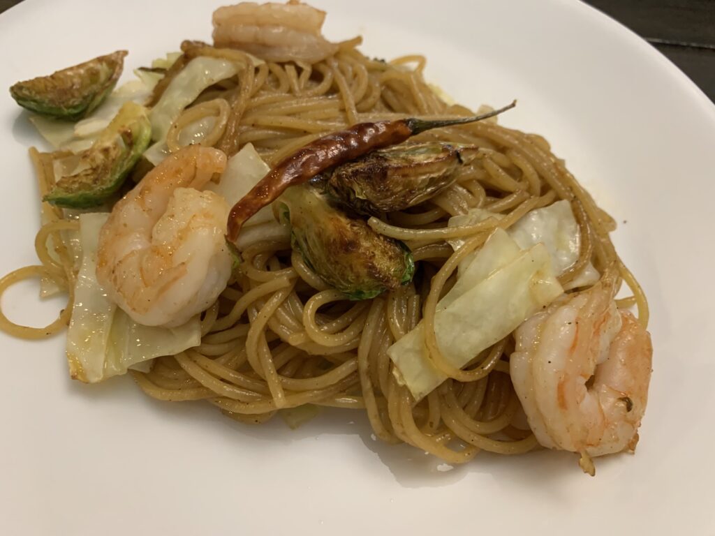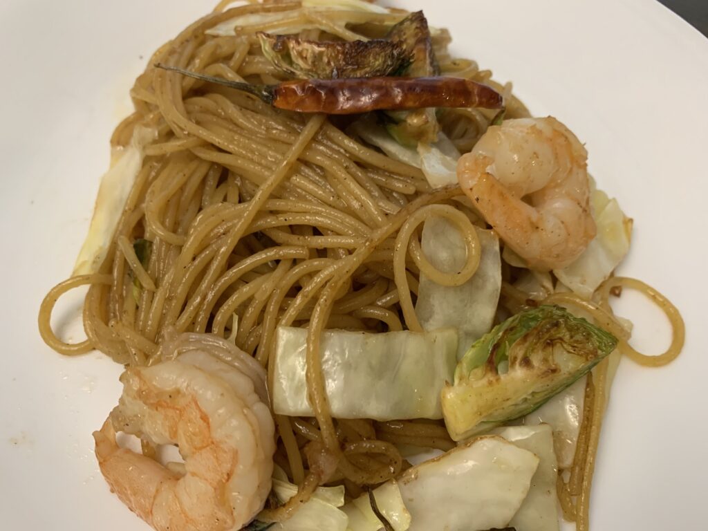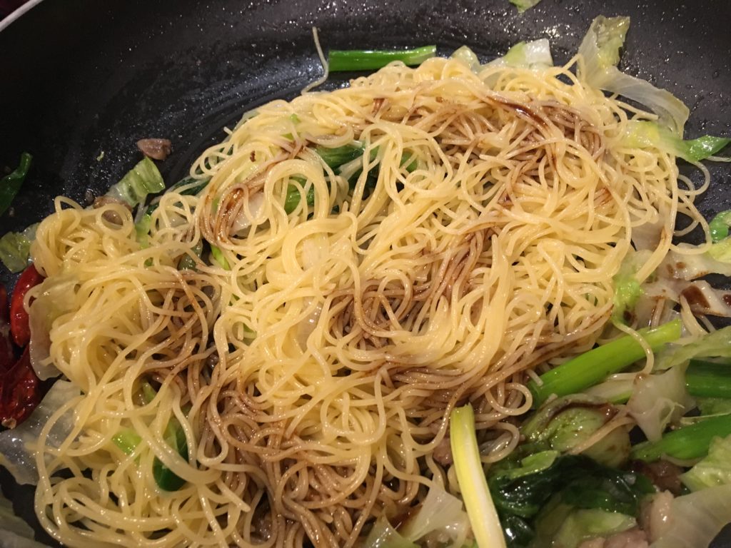 鍋に水、そしてパスタ。今回は天使毛を使用。普通のスパゲティなら6時間程度放置。天使毛(Angel Hair カッペリーニ)なので2時間。油そばでおなじみのモチモチ麺。焼きそば専用麺にはもう戻れない。(ご注意ください)