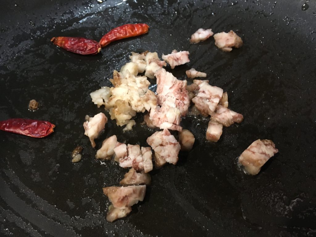 まずはお肉なんだが、今日は先日の頬肉の脂がある。これを細かく切って肉代わりに。重要:ステーキ等は脂が美味しいわけだが、脂の量が多すぎたり、胃腸弱者であるために全部食べきれない場合、捨てずに冷蔵保存して、こうして炒め物に使うと美味いというかこれと塩だけご飯にかけて食べれるやつこそ才能あるデブ。肉とかいらない、これだけで今日の勝利確定。