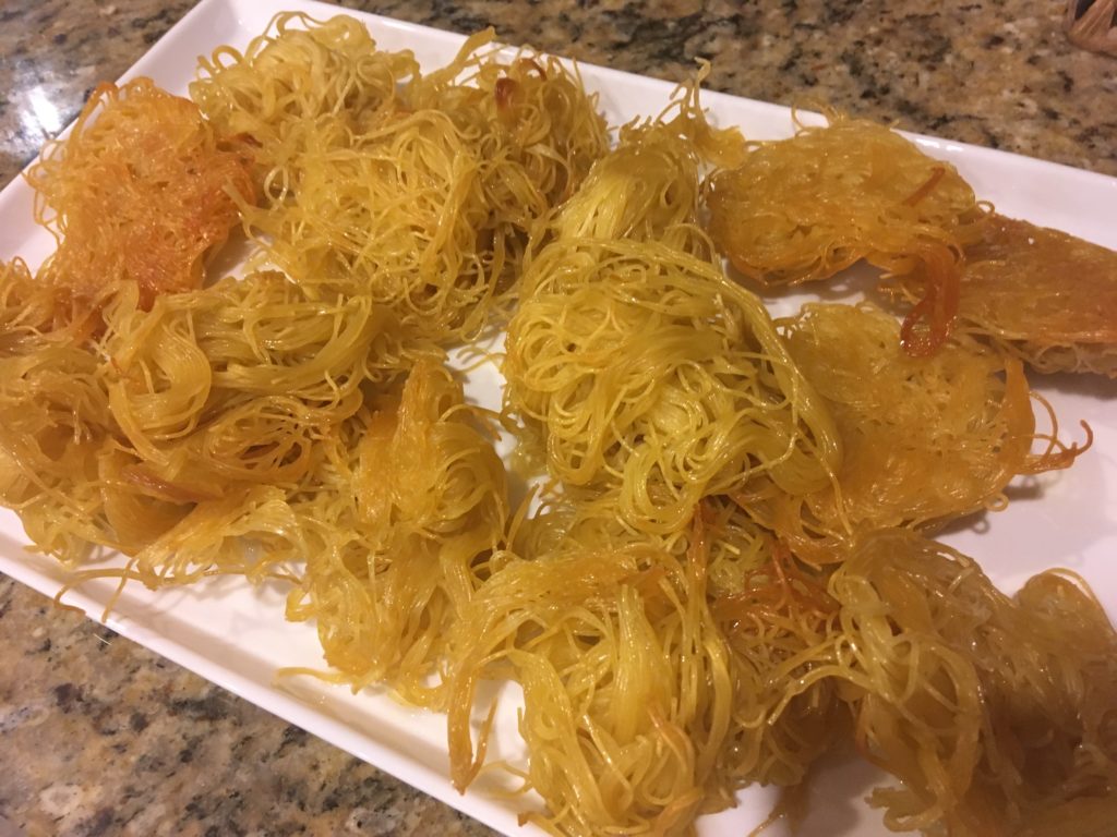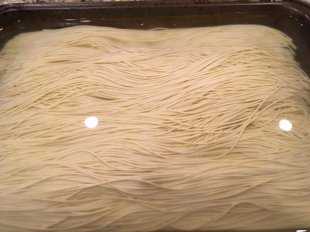 天使毛、Angel Hair を水に浸す。2時間程度。パスタはBarillaブランドを使用。メリケンパスタだと溶けるらしい。