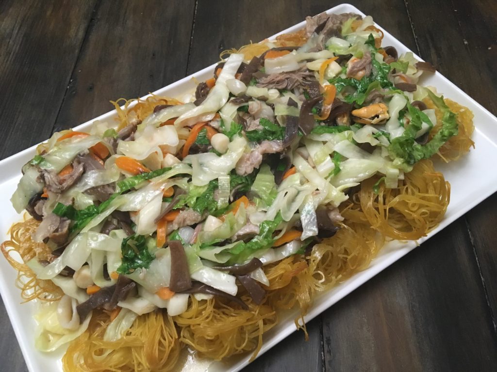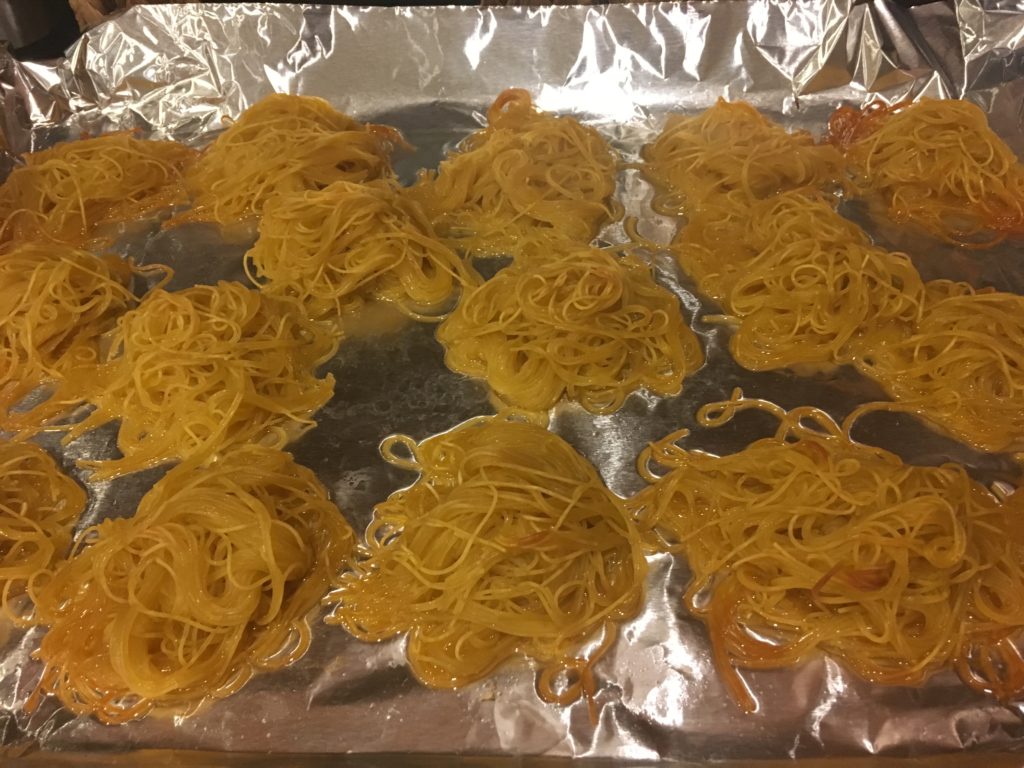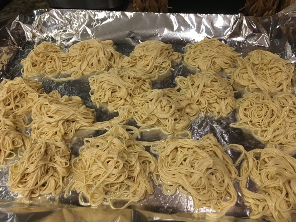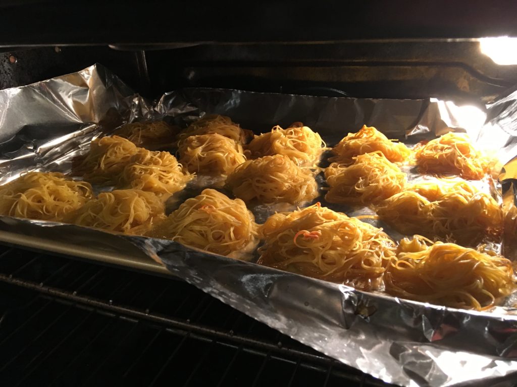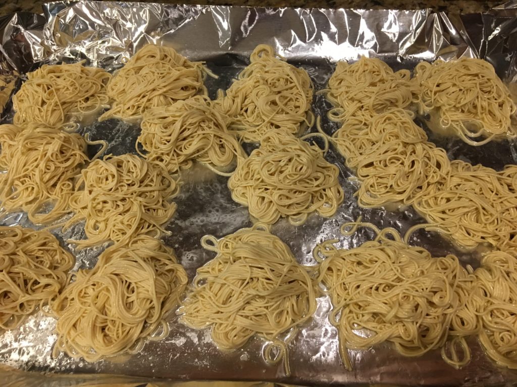 ホンモノのかた焼きそばっていうのは、茹でた中華麺を揚げて水分をぶっ飛ばしてしまうというやつ。水分が飛んだところにあんかけが絡んで美味い。これを家庭でやるのはめんどくさいし、6人分とかアレなので、オーブンでエミュレートしましょうという話。
