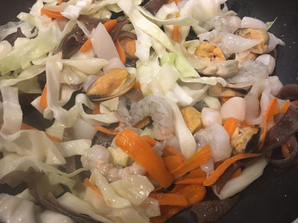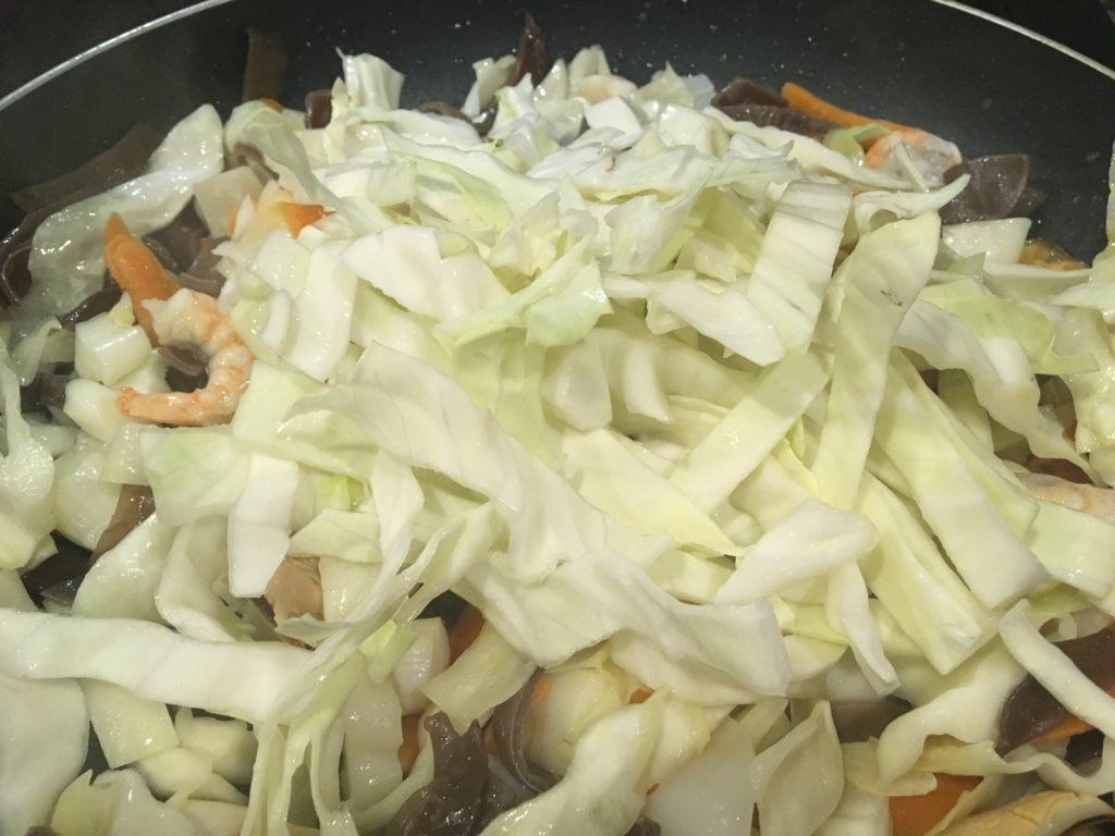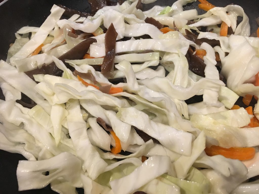 キクラゲから炒め始めることが多い。その後ニンジン、そしてキャベツは全部ぶち込まず、芯とか硬めのところだけを。