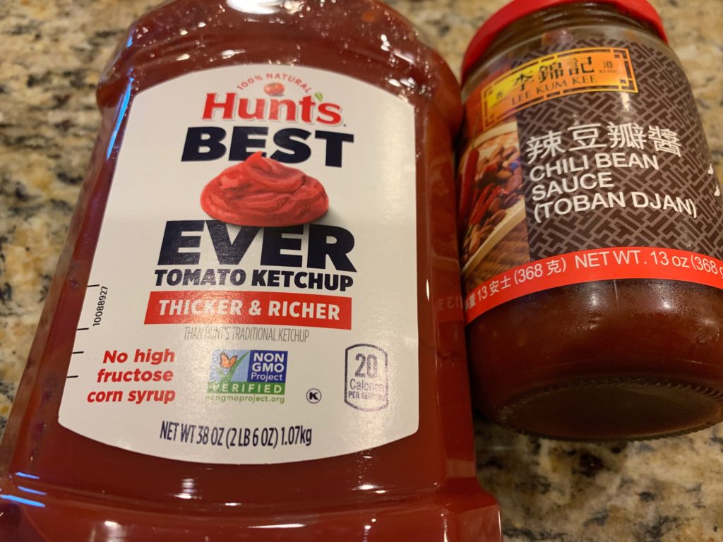 こだわりの目分量。ケチャップと豆板醤。計量したりすると、どうしても目盛りの味がついてしまうので、男らしくお願いしたい。