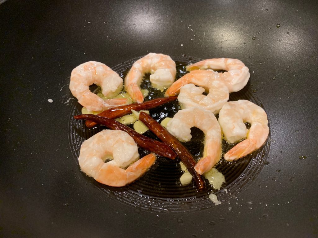 海老投入。コツはあんまり触らないこと。それはどんな料理でも同じだが。どうせもう火は通ってるんだから、ひっくり返すだけ。