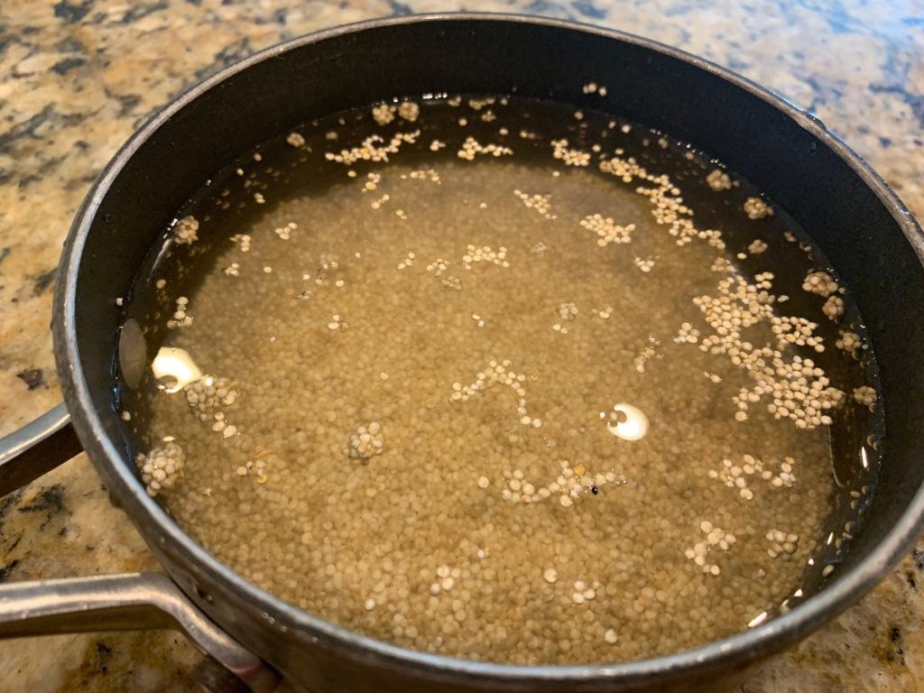 水はキヌアの倍。これを足してコメと同様に炊く。家に鍋がなくて炊飯器でコメを炊いている人は、炊飯器で普通に炊いてよし。水は米の倍。
