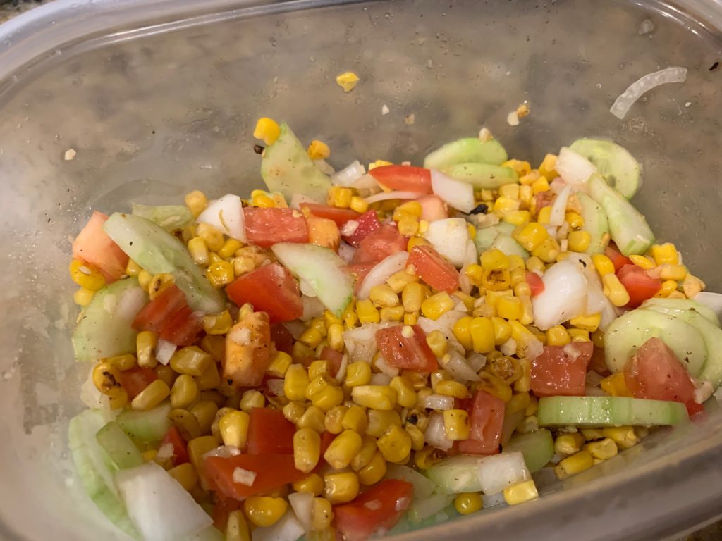 キヌア以外の物はテキトー。今回は、キュウリ、タマネギ、トマト、コーン缶。乾燥オニオンも入れた。これらに塩、レモンジュース、オリーブオイル、醤油ほんのちょっと。そんだけだ。オリーブオイルを入れるときは目を瞑ろう。難しかったら目隠しでもよい。