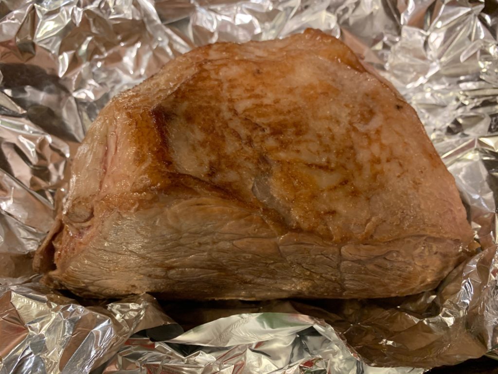 250℃ (480F) にしたオーブンにこのまま蓋とかせず投入。すぐドアは閉めること。このままオーブンを消して寝る。消すので、オーブン内の温度は下がり続ける。表面は250℃に晒されるが、内側まではもちろん届かない。