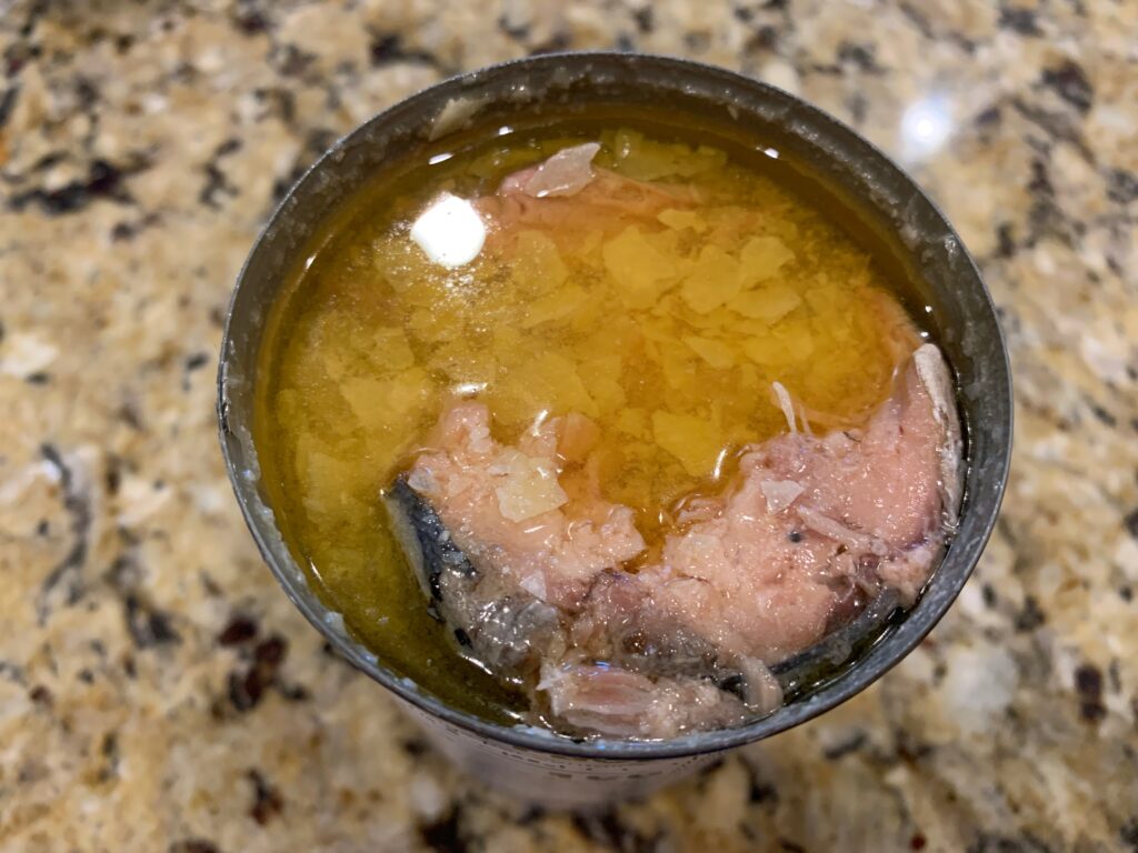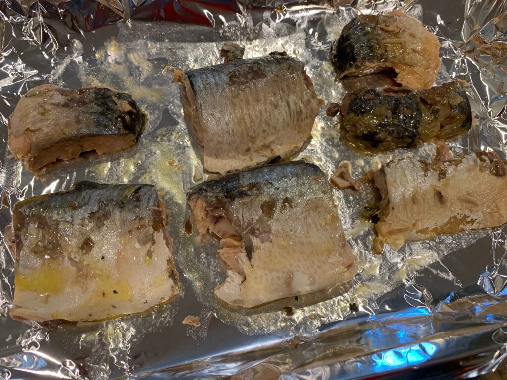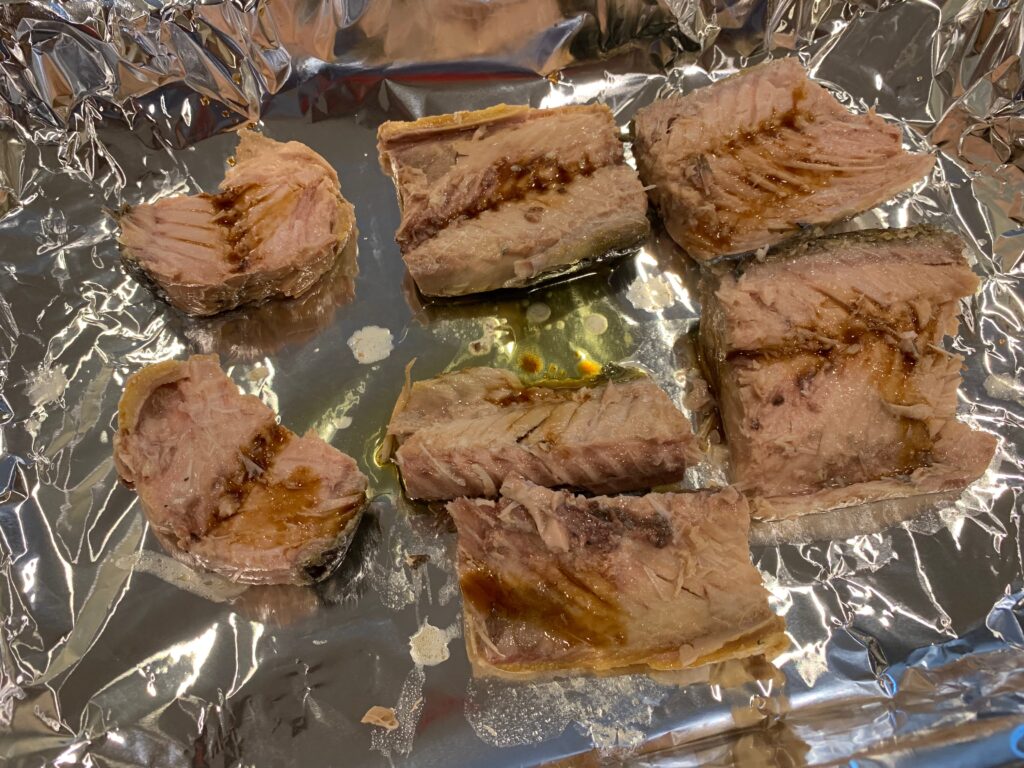 200℃ (390F) に熱したオーブンに入れて、Broil LOW 3分してオフにして5分放置、そもそもすでに焼けてる缶詰なので、そんな待つ必要もない。