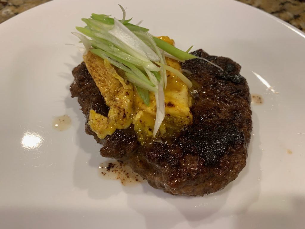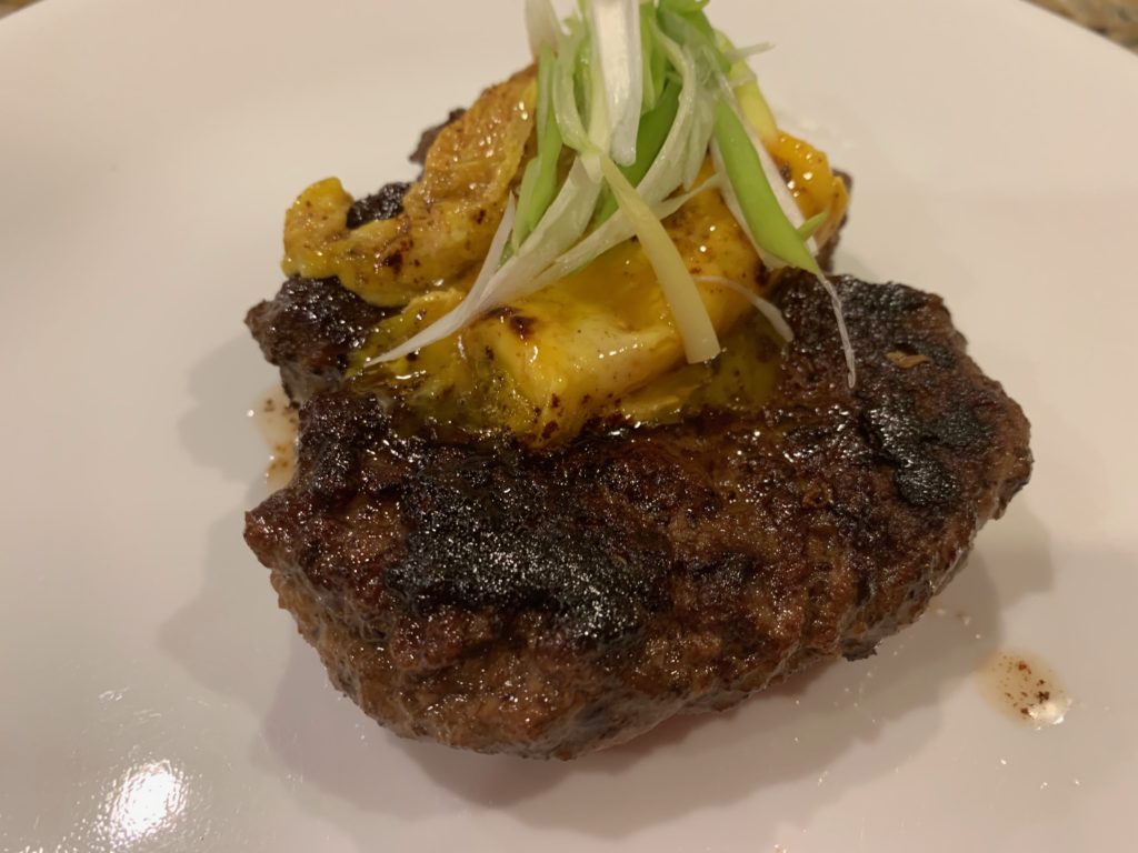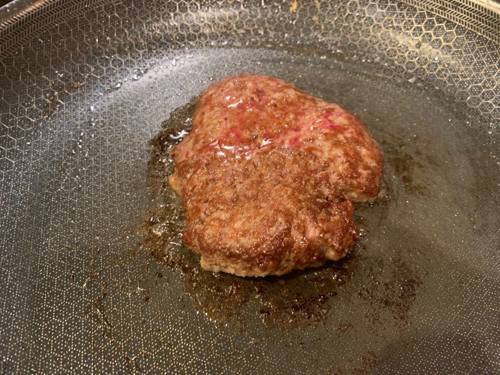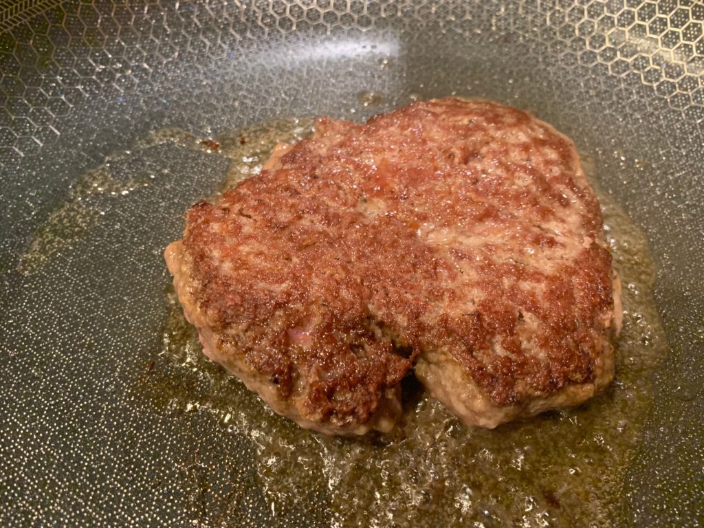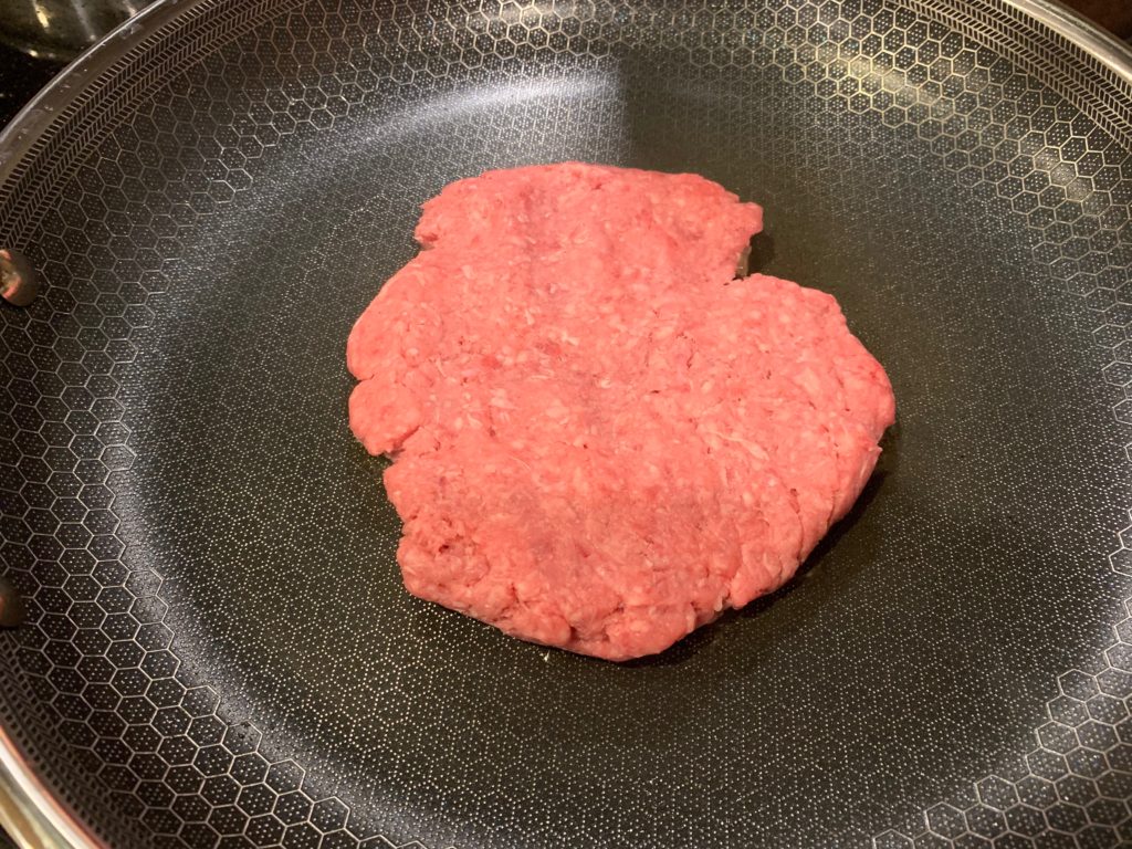 さて、温まった鉄板を中火にしてお肉。形を整えただけ。薄めにした。脂として大半が流出するので、食べる頃には小さくなってる。大きすぎたりはしない。そもそも肉を食いすぎるとか人類には不可能なことであるし。