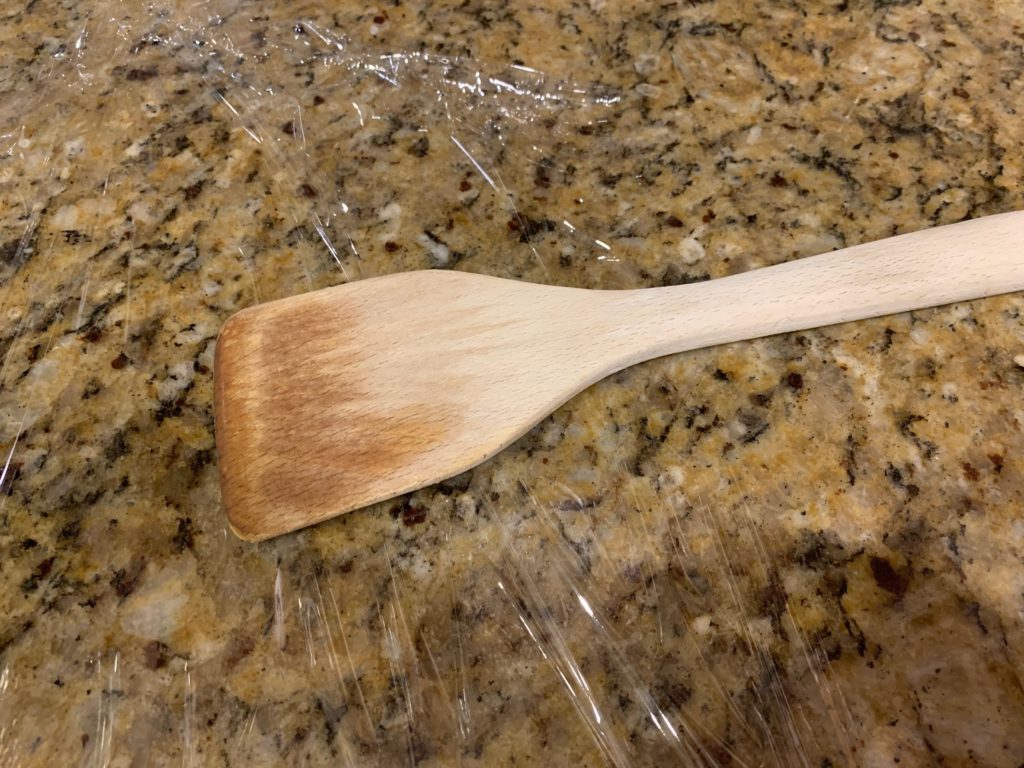どうでもいいけど、キッチンの作業台にラップを敷いてこういう感じで調理器具を置いたりする。