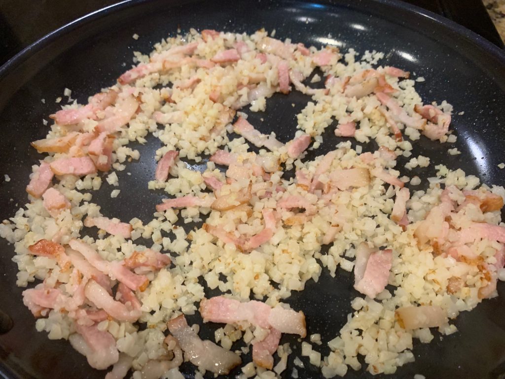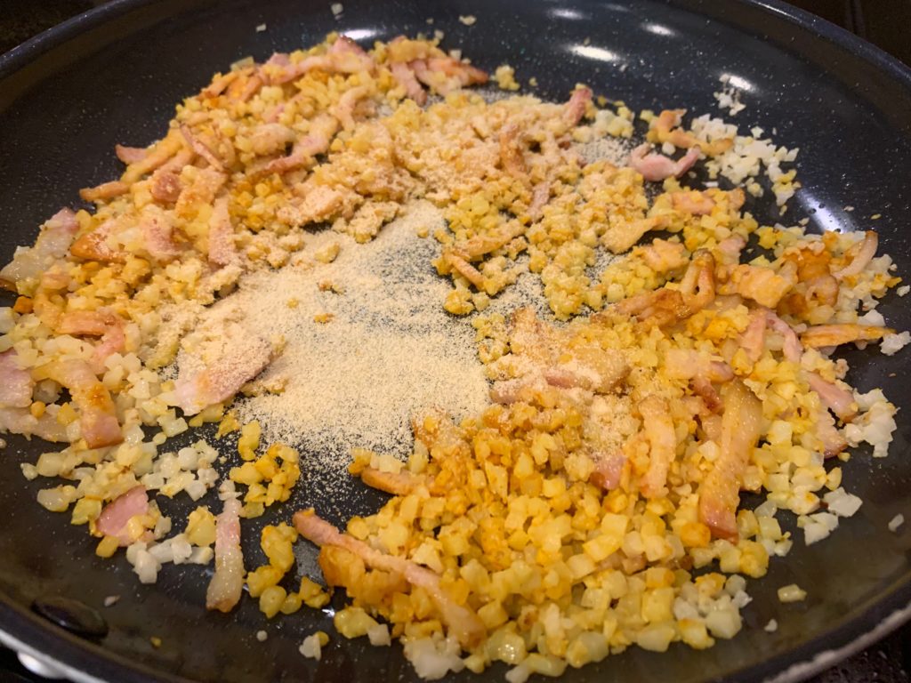 枝豆レンチンしてる間に(というかカリフラワーをレンチンした皿で枝豆レンチンするの!)、カリフラワーを炒める。