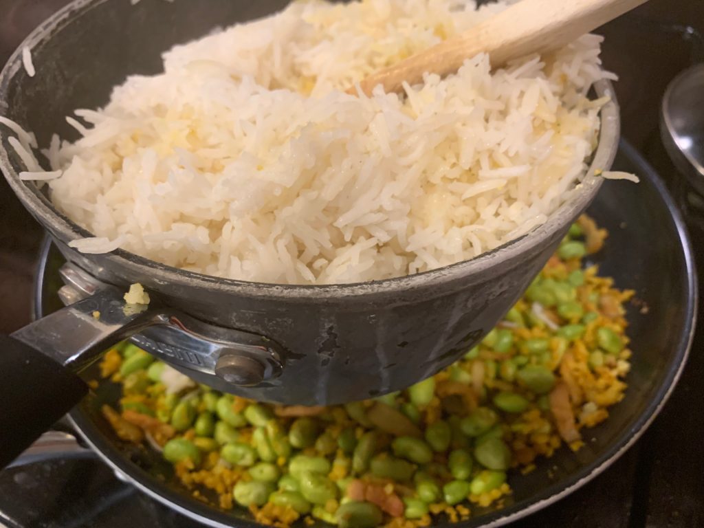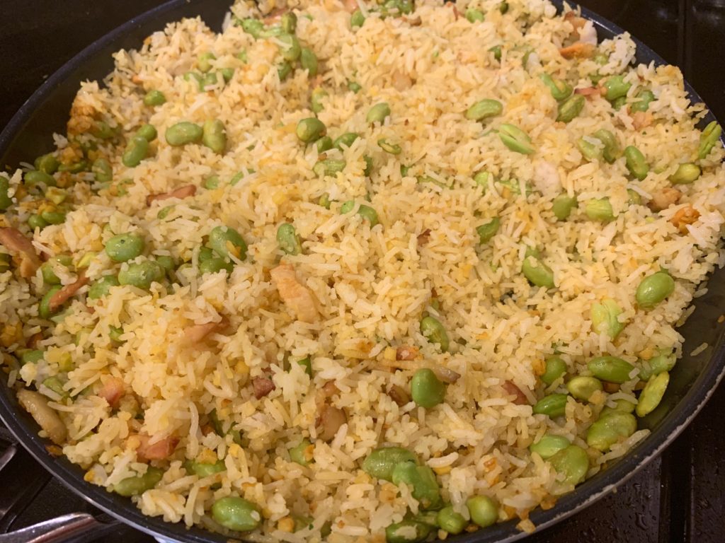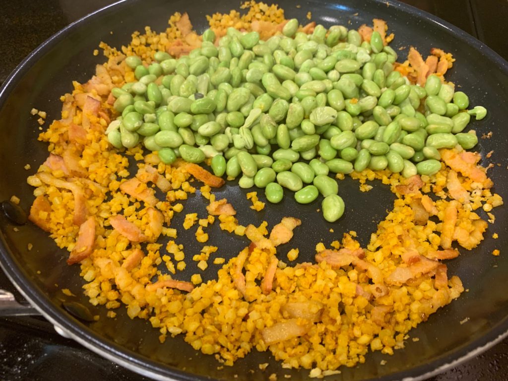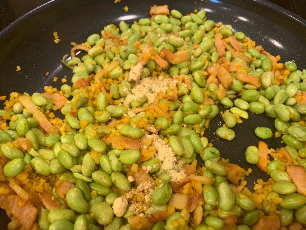 はい今日の主役、枝豆さん。なんと剥いたやつが冷凍で売ってる。さすがアメリカ、まず皮むくのね。飲み物のように枝豆を消費できてツマミにならないのは残念だが、料理には便利。こいつをレンチン。