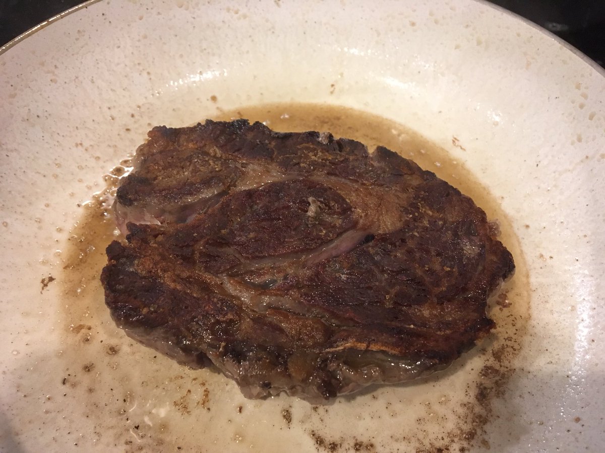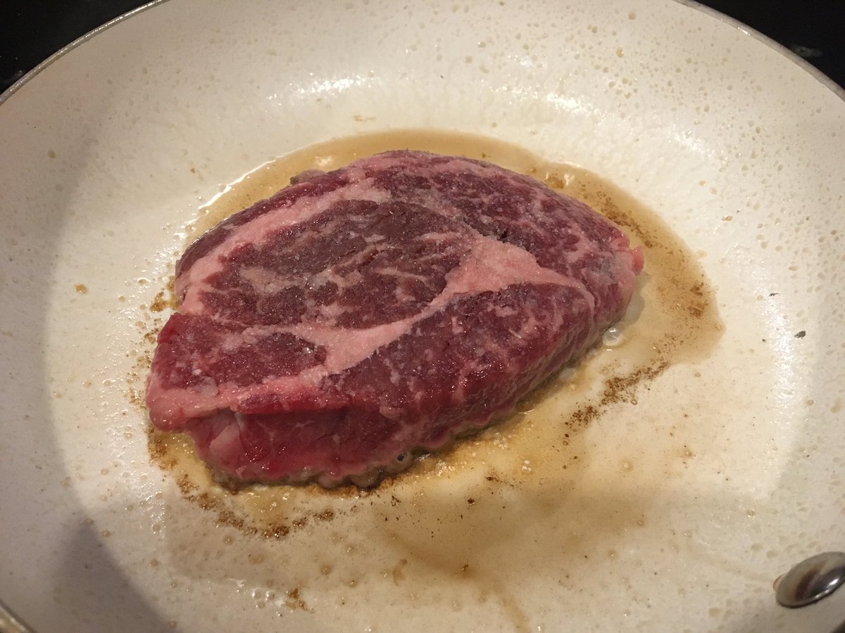 ガチガチの強火で焼く。マジでガチだからな。ウチではすでに退役した古いフライパンを使ってる。なぜ強火かと言うと、内側には火を通さず、外側だけ焼きたいからだ。熱の伝達には時間がかかる。表面だけ焼き焦がすには強火で短時間。