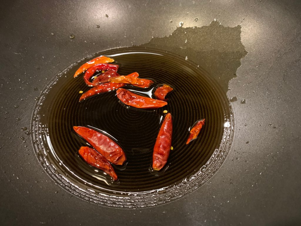 油に唐辛子。実はいつもオリーブオイルを使っている。長生きして安く死にたいので。