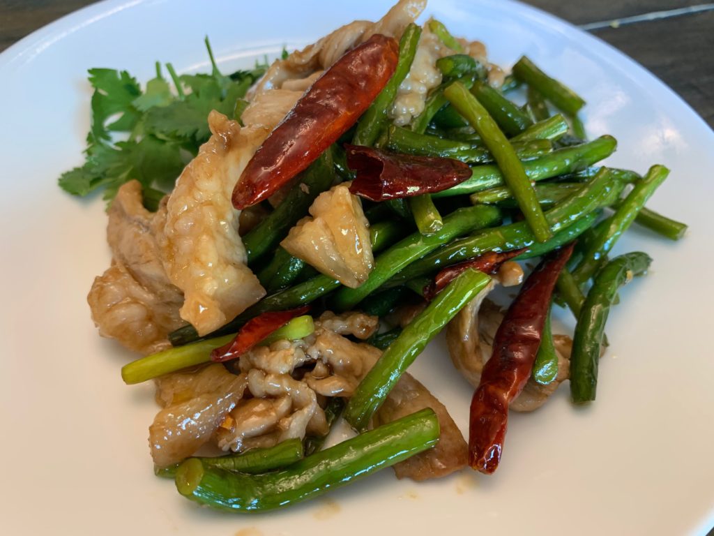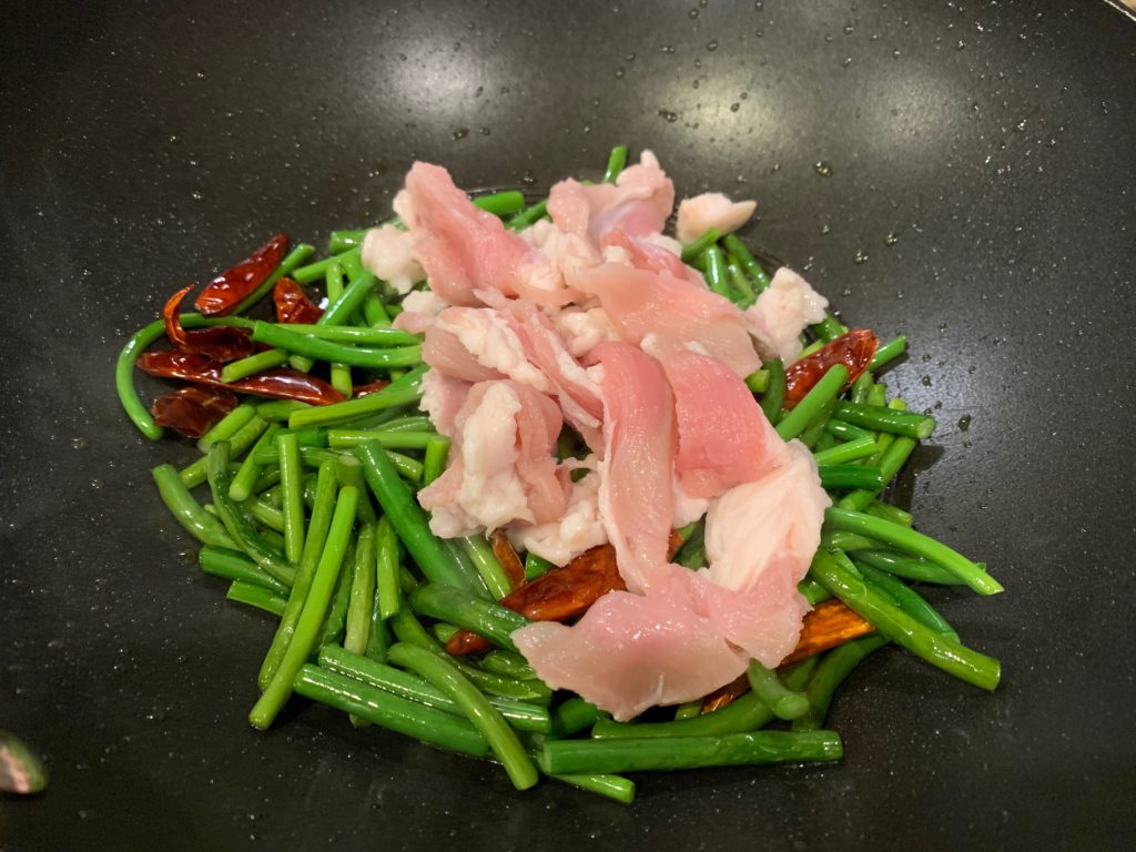 表面が焼け始めたところで豚肉を。あとから豚肉を足すというのは勇気がいるが、STEMはまだまだ火を通さないといけないので大丈夫。脂身が多く、実は皮もついてる(←美味い)ような脚の肉を薄く切った。