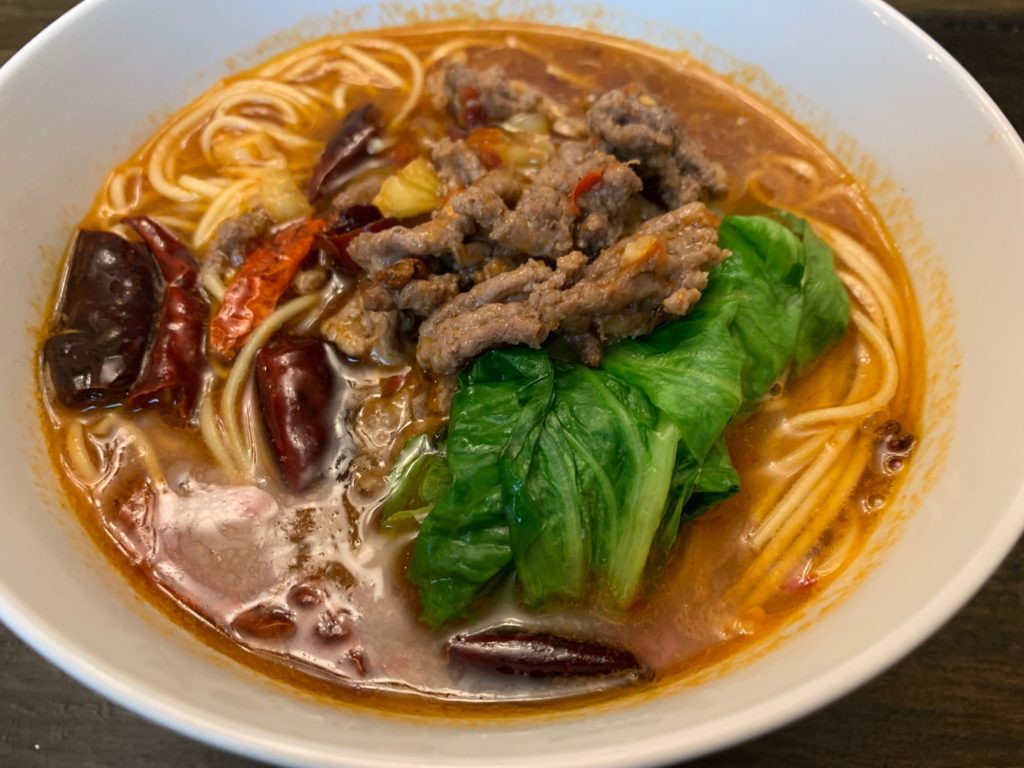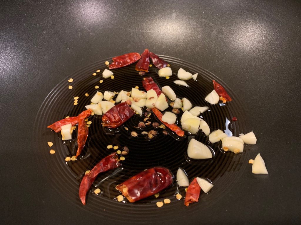 フライパンにニンニクと唐辛子と花椒。花椒入れるだけで一気に本格化するのでぜひ手に入れたい。