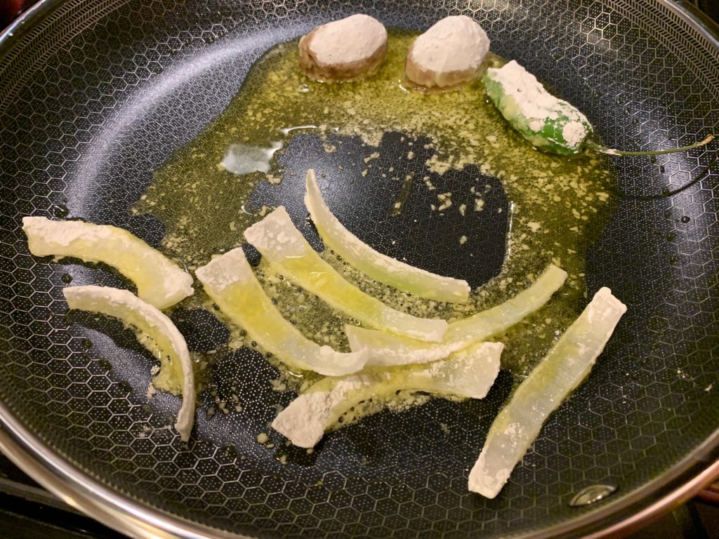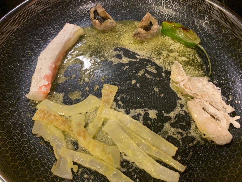 タマネギも足して、菌と実と。油を軽く敷いてしっかり温めたフライパンに。中火。