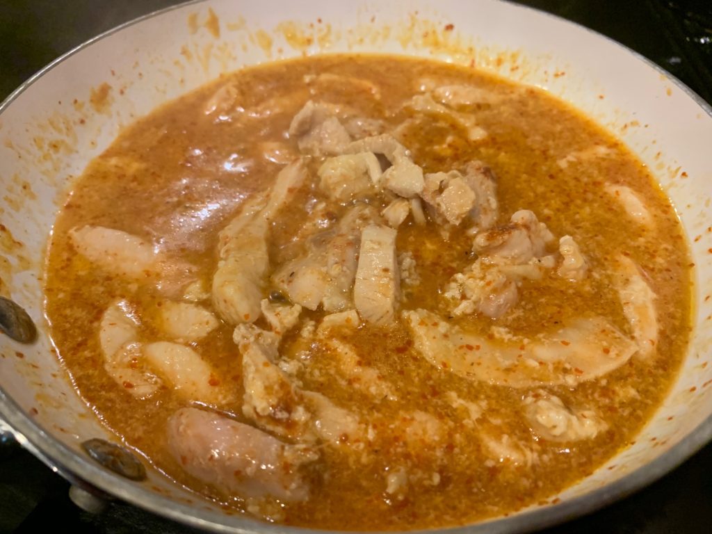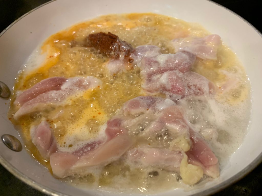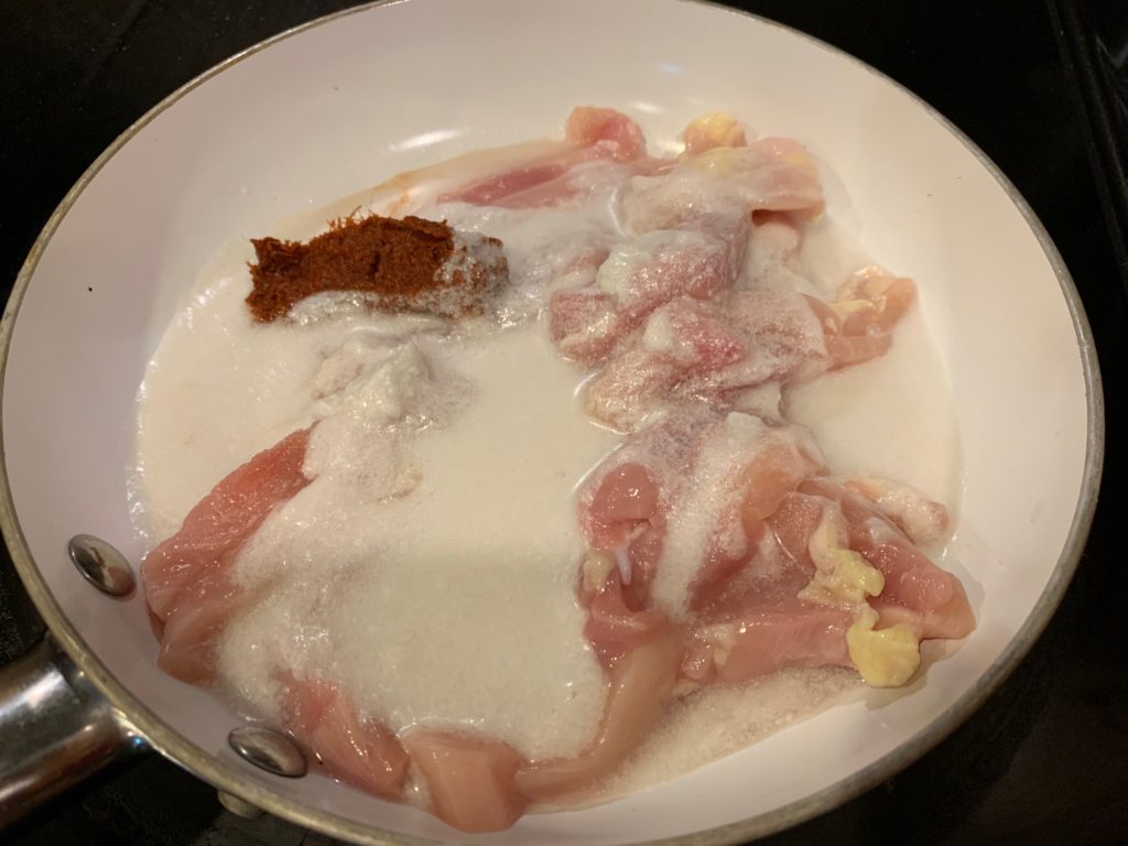 フライパンに肉とココナッツミルクとカレーペースト。面倒くさいので火をかける前に全部フライパンに乗せた。