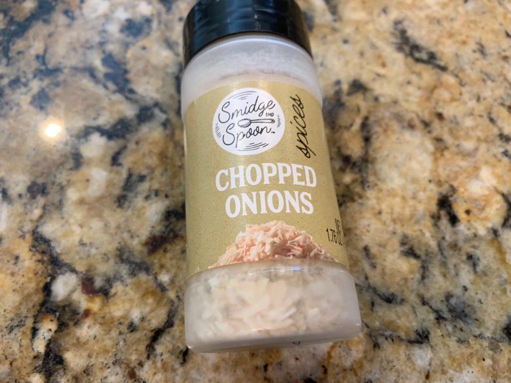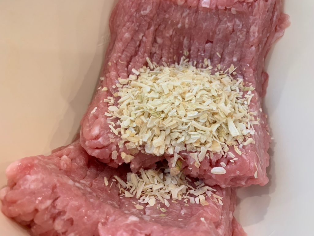 オニオンはこれ。乾燥チップ。スーパーのスパイスコーナーに安く売ってます。これを水で戻すとあの店の(その話はまたにしましょう