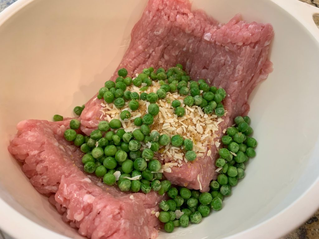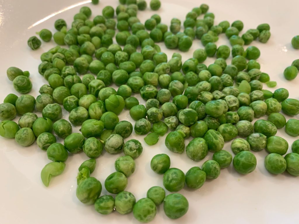 冷凍庫から取り出したばかりの新鮮な冷凍グリンピースを2分くらいレンチンしたやつ。