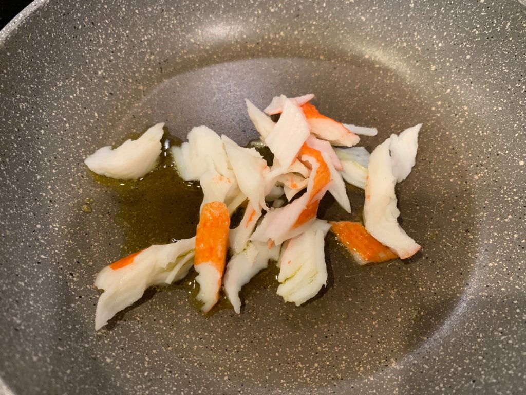 カニカマがお宅の冷蔵庫にあるはずです。常備しといてって言いましたよね? 無いならエビとかサーモンでも良いでしょう。もちろんカニで代用することも可能。