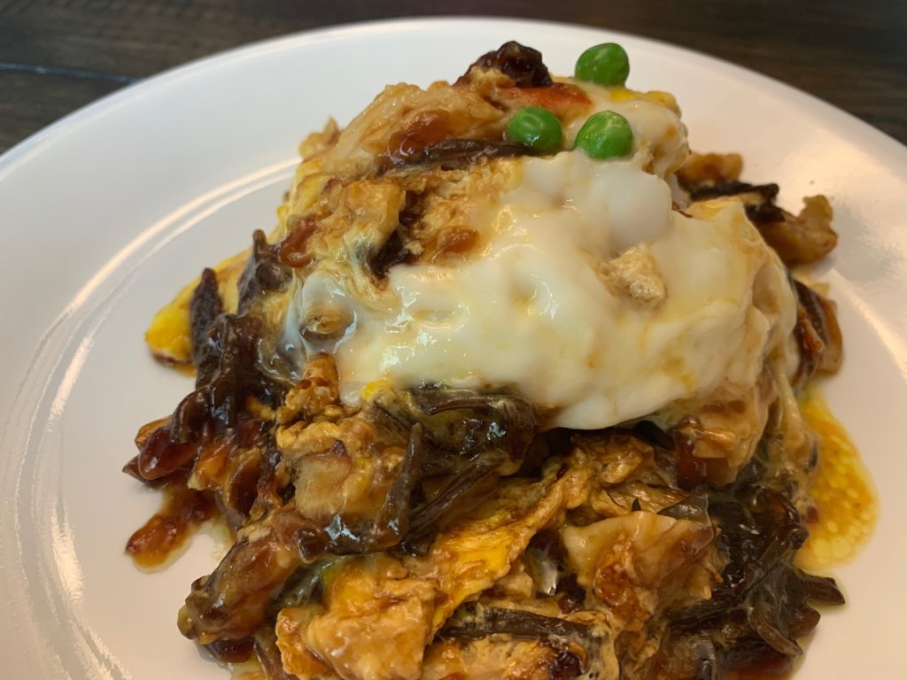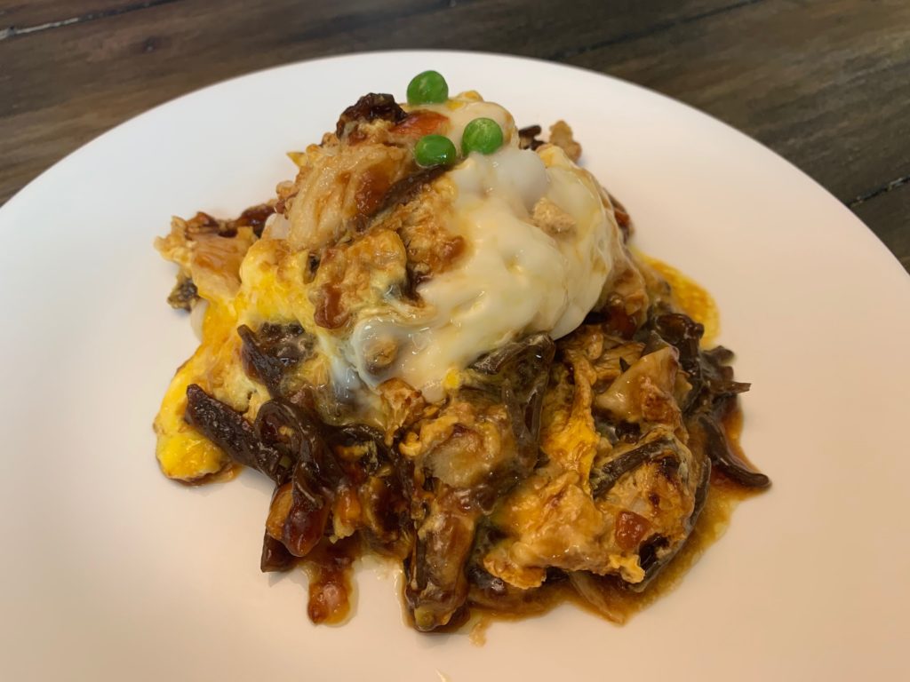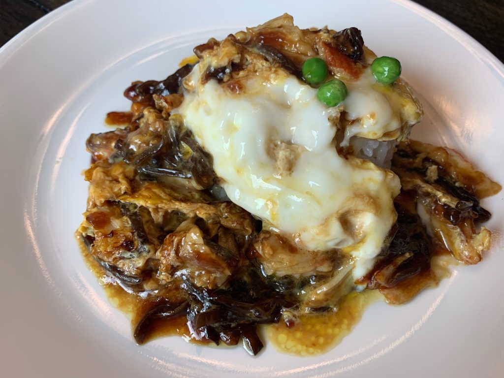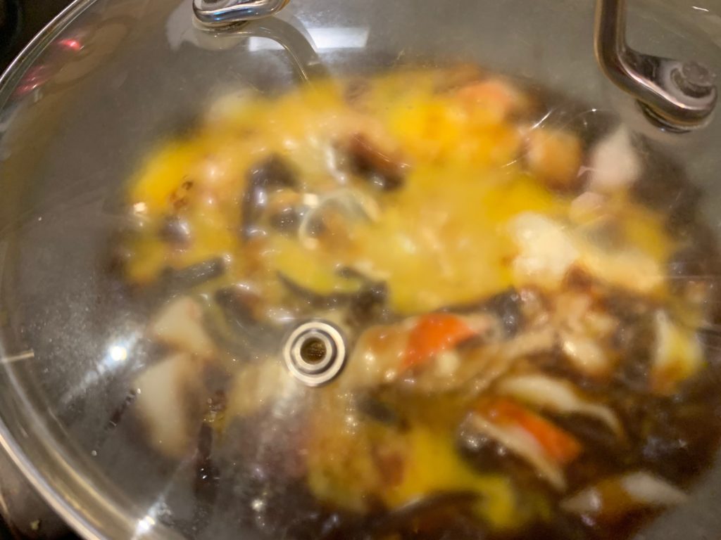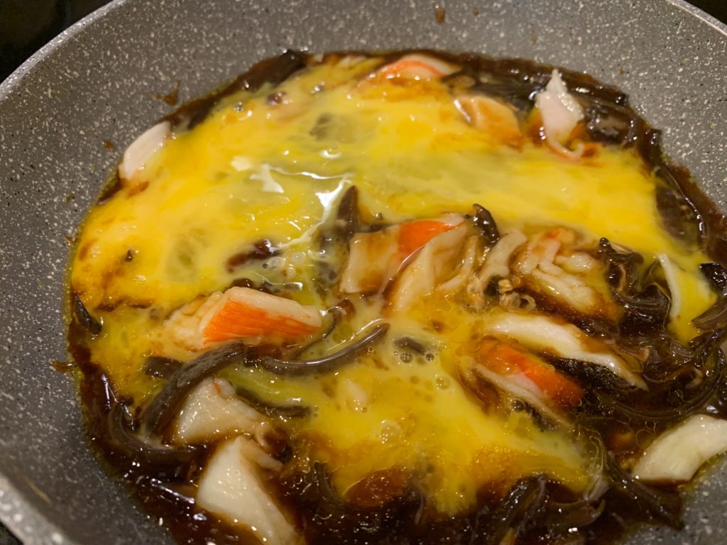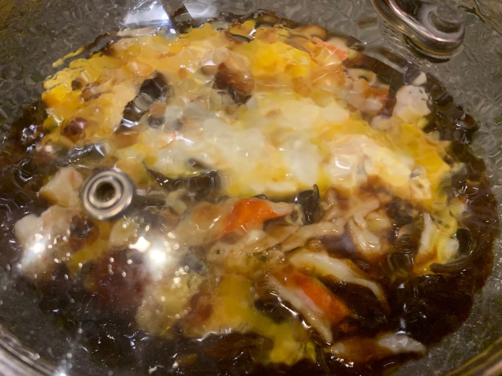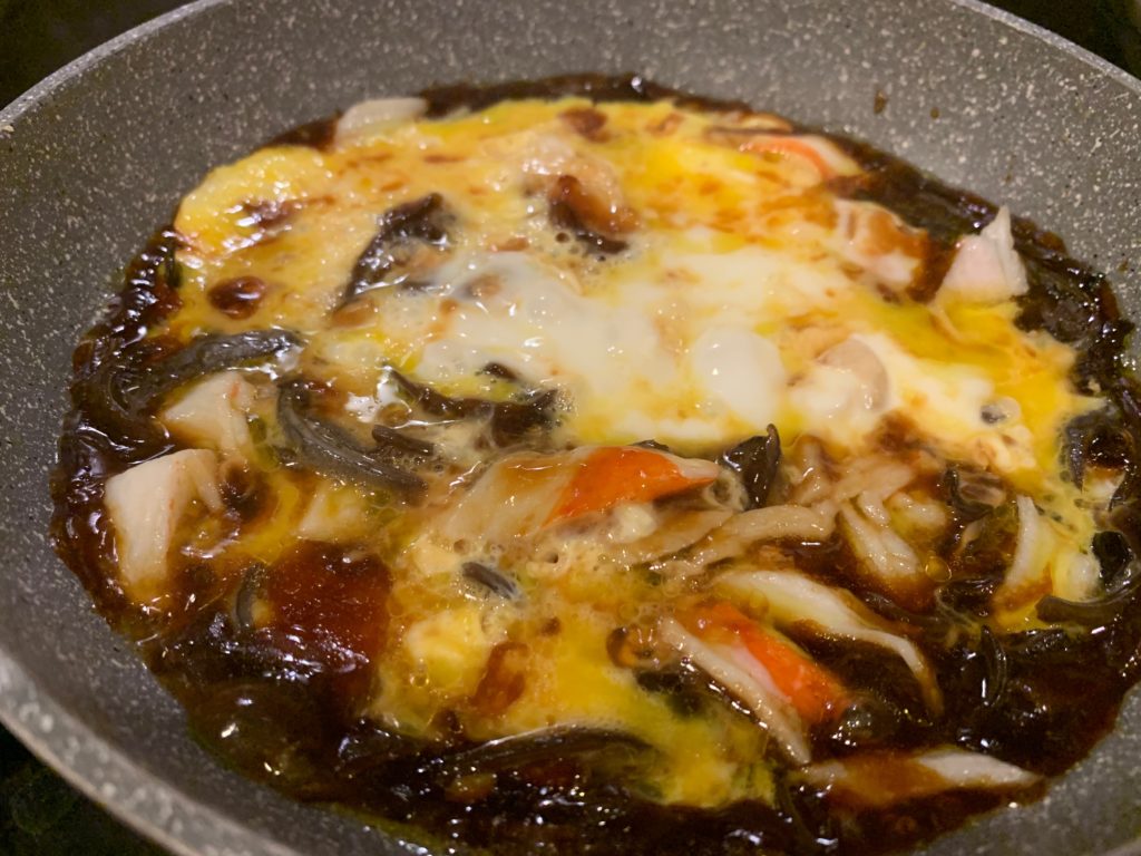 今日はあんかけ先に入れたので蓋を。あんかけ後乗せなら、蓋無しで玉子丼と同じように玉子を作る感じ。