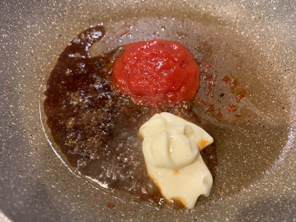 火を止めたフライパンにマヨ、ケチャップ、醤油、ウスターソース。もちろんこだわりの目分量。