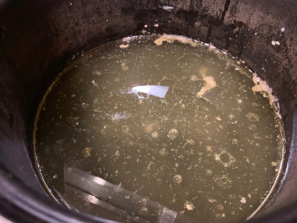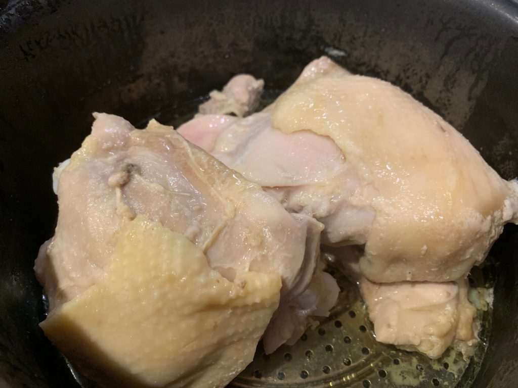 鶏は冷蔵庫。スープが残る。これをザルで越せば良い。