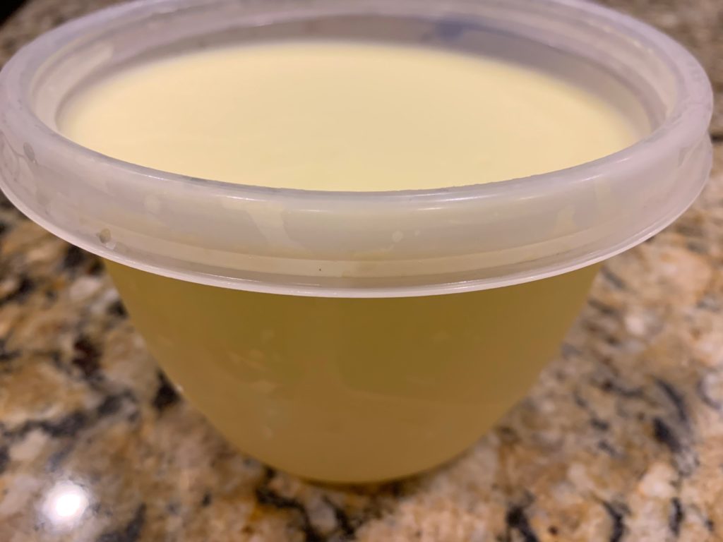 今回はすぐ食べずスープも冷蔵したので、こんな感じに。白い部分が脂なので、脂分調節しやすい。