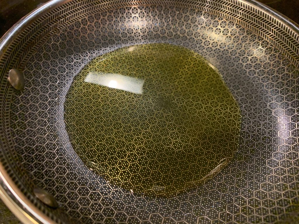 フライパンに薄く油をしっかり温める。いつもどおりオリーブオイル(ストアブランドの一番安い超バージン)です。