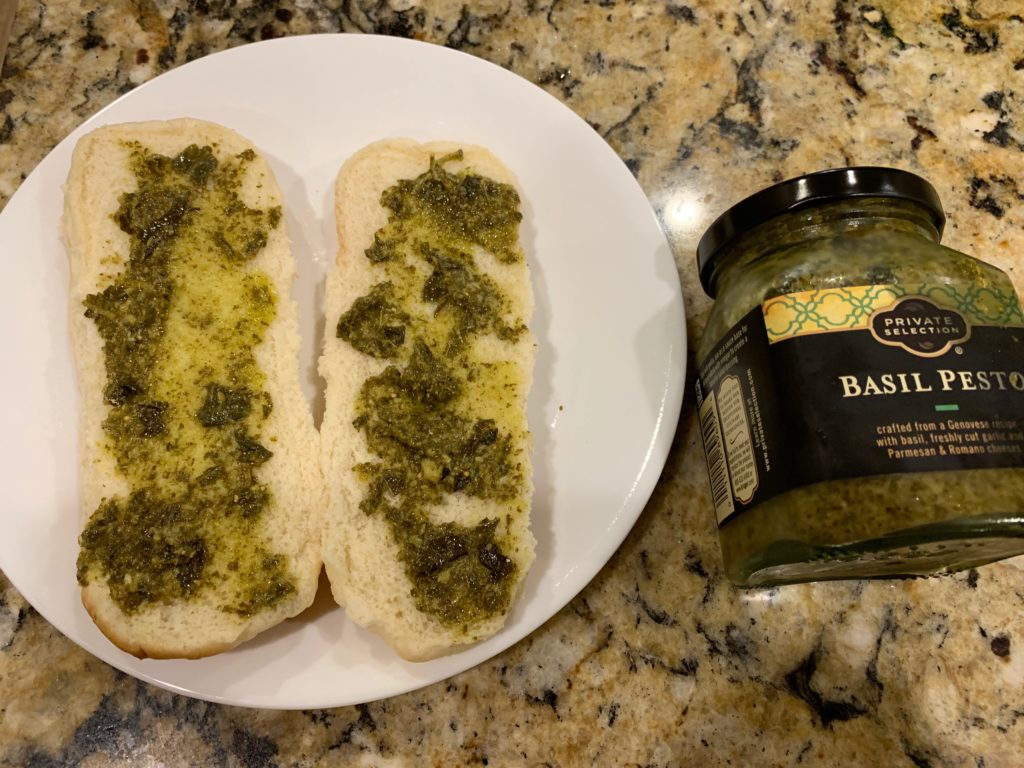 あればバジルペストをパンに。なければパセリ粉とオリーブオイルでも良い。