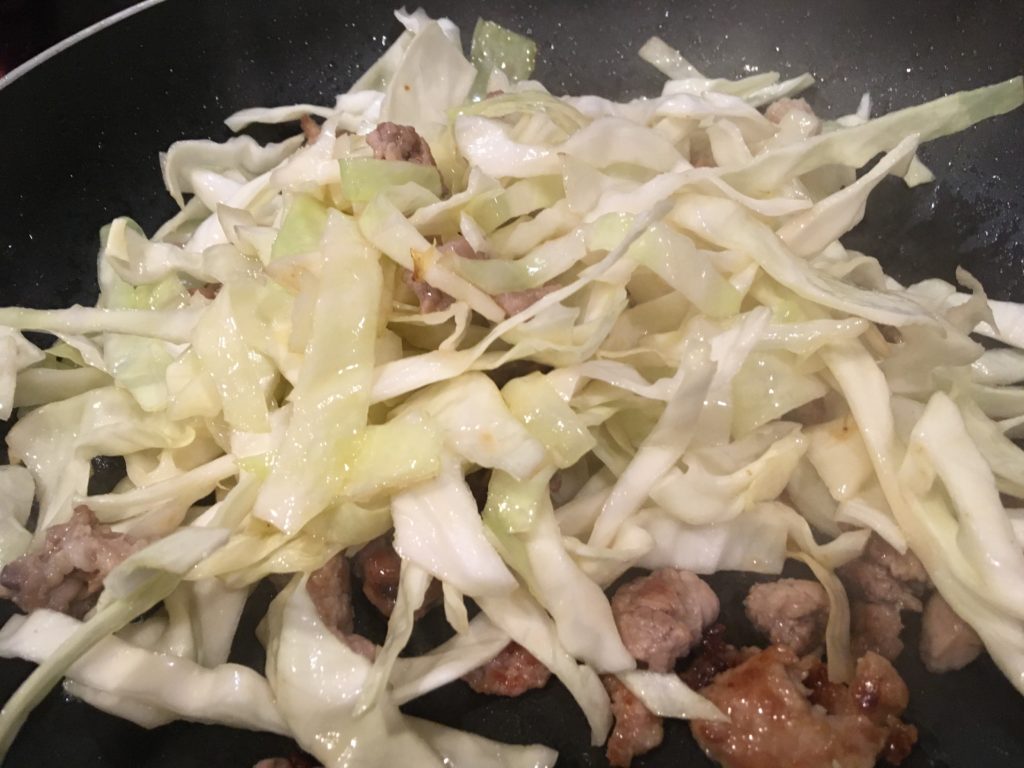 肉に火が通ったら砂糖多めに撒いてキャベツ。