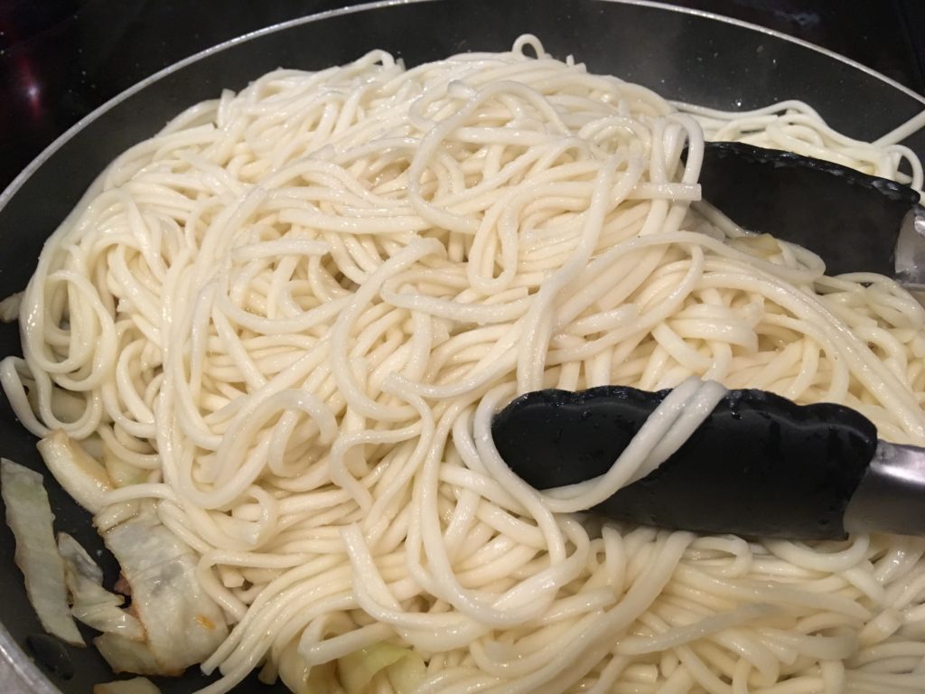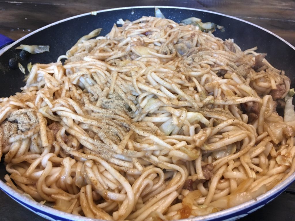 一人分だけ作るなら、上の写真みたく世界で初めて焼きうどん出した店みたいなやつを作れるんだけど、大人数分だとちょっと劣る。それでも美味いので大量に作って大量に食べよう。