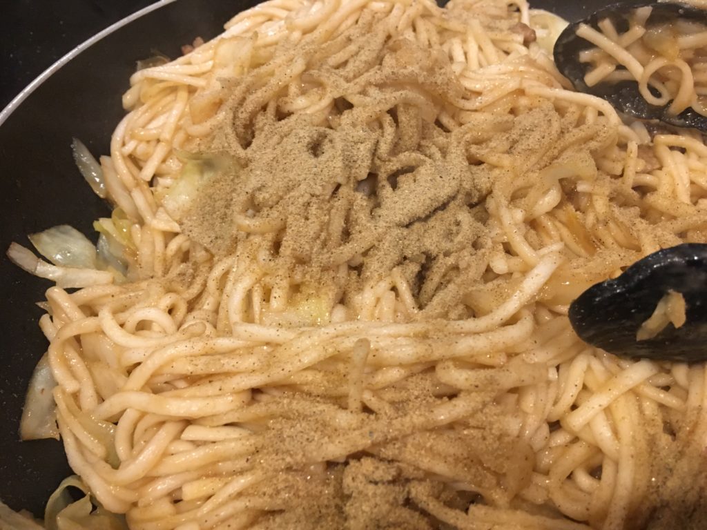 さらにウスターソースと油。煮干しの粉とかあるとよい。